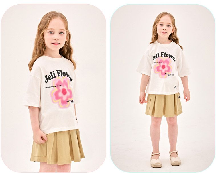 韓國 Jelispoon - 暈染花朵短袖上衣X打褶裙套裝-白X卡其