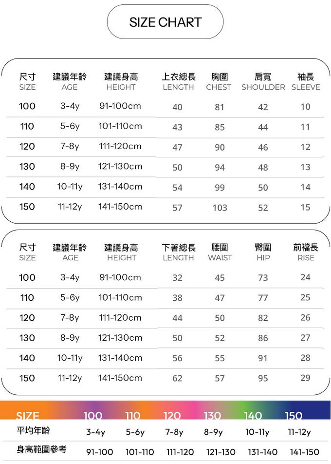 1. 尺寸表單位皆為公分(cm),實際尺寸會因布料彈性、水洗、測量起迄點等因素略有誤差。建議參考孩子平時穿著衣物尺寸進行選購。