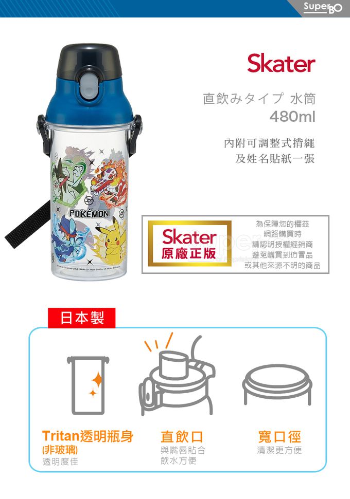 日本 SKATER - (兒童)直飲式透明水壺-寶可夢Pokemon-480ml