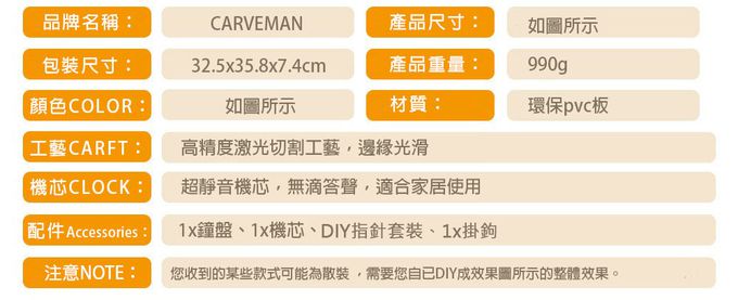 成分:尺寸: 詳如圖文 包裝尺寸: 32.5x35.8x7.4cm 配件: 鐘盤x1/機芯x1/DIY指針套裝/掛鉤x1
