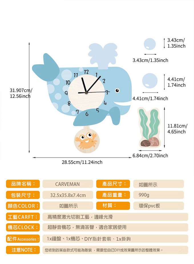 成分:尺寸: 詳如圖文 包裝尺寸: 32.5x35.8x7.4cm 配件: 鐘盤x1/機芯x1/DIY指針套裝/掛鉤x1