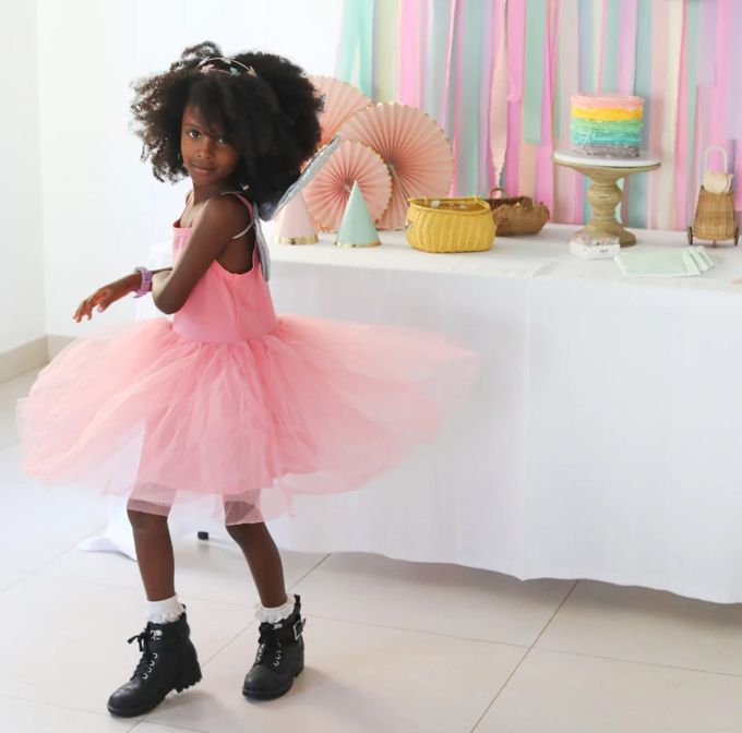 穿上牡丹粉芭蕾連身蓬蓬紗裙,再搭配一雙黑色小馬靴,彷彿化身一個舞台巨星,下一刻就要拿著電吉他,跳上舞台大唱 Rock 'n' roll!若搭配娃娃鞋,則是化身成優雅可愛小淑女;穿上球鞋,就是運動風小甜心!這是一件能穿四季、又百搭的漂亮洋裝呀!
