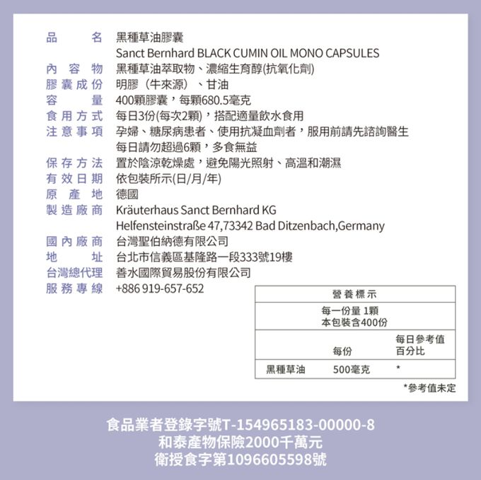 Sanct Bernhard 德國百年草本-黑孜然黑種草油膠囊500mg(400粒/罐)