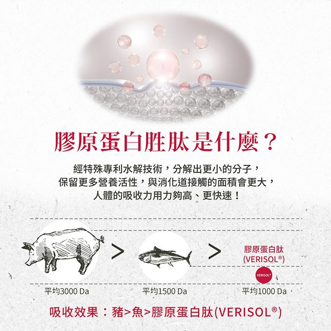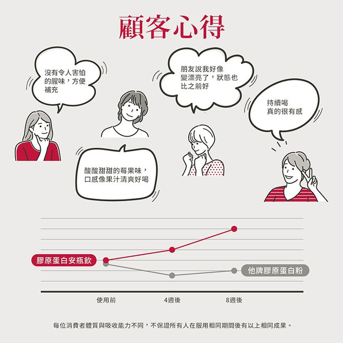 成分:水、野櫻莓、草莓、黑醋栗、黑莓和接骨木濃縮汁;膠原蛋白肽 (11.6%)、龍舌蘭糖漿、透明質酸 (0.5%)、維生素 C、防腐劑山梨酸鉀、葡萄糖酸鋅、維生素 E 醋酸鹽、葡萄糖酸銅、β-胡蘿蔔素、填充劑麥芽糖糊精、生物素。