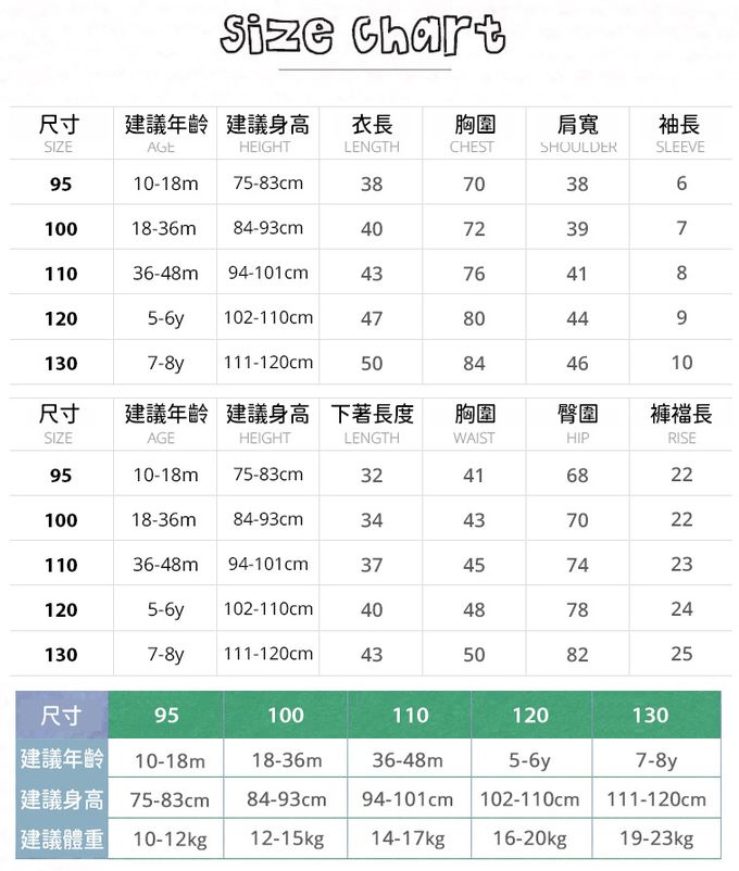 1. 尺寸表單位皆為公分(cm),實際尺寸會因布料彈性、水洗、測量起迄點等因素略有誤差。購買前,建議參考寶貝現有的衣物尺寸做對照。