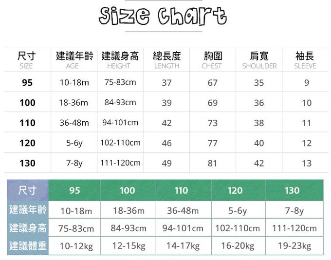 1. 尺寸表單位皆為公分(cm),實際尺寸會因布料彈性、水洗、測量起迄點等因素略有誤差。購買前,建議參考寶貝現有的衣物尺寸做對照。
