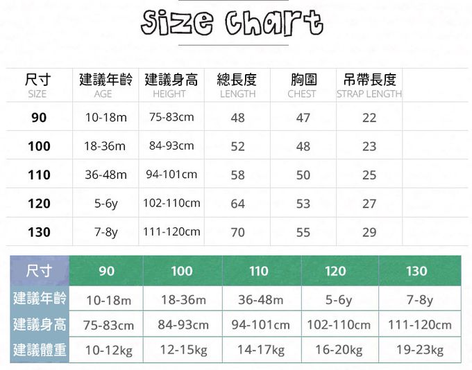 1. 尺寸表單位皆為公分(cm),實際尺寸會因布料彈性、水洗、測量起迄點等因素略有誤差。購買前,建議參考寶貝現有的衣物尺寸做對照。
