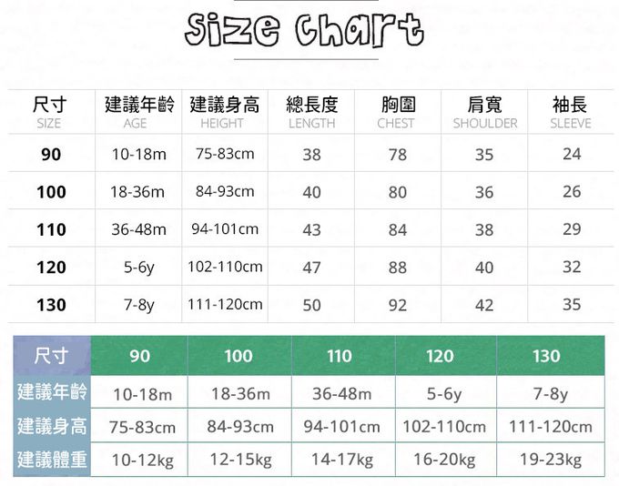 1. 尺寸表單位皆為公分(cm),實際尺寸會因布料彈性、水洗、測量起迄點等因素略有誤差。購買前,建議參考寶貝現有的衣物尺寸做對照。