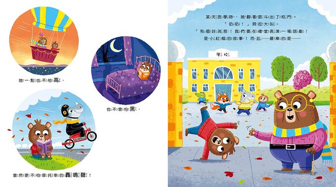 幸好,在奶奶的開導和指引下,貝拉漸漸明白,「原來每個人都可能會有害怕的時候」,而其實害怕並不完全是不好的事情,它有的時候會保護我們,有的時候更會給予我們表現勇敢的機會呢!在明白了這些道理後,貝拉鼓起勇氣,慢慢學會克服了自己的害怕情緒。值得一提的情節是,在故事的最後,奶奶竟然也因為需要臨時幫忙上台演出一個角色,而表現出害怕的樣子--這次換成貝拉來鼓勵她了!最後,在奶奶的陪同下,兩人順利完成了一次精彩的演出。這樣的安排真的讓讀者很有感悟,確實不只是孩子,身為大人的我們也常常有許多感到害怕的時候啊!