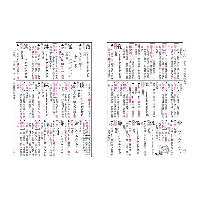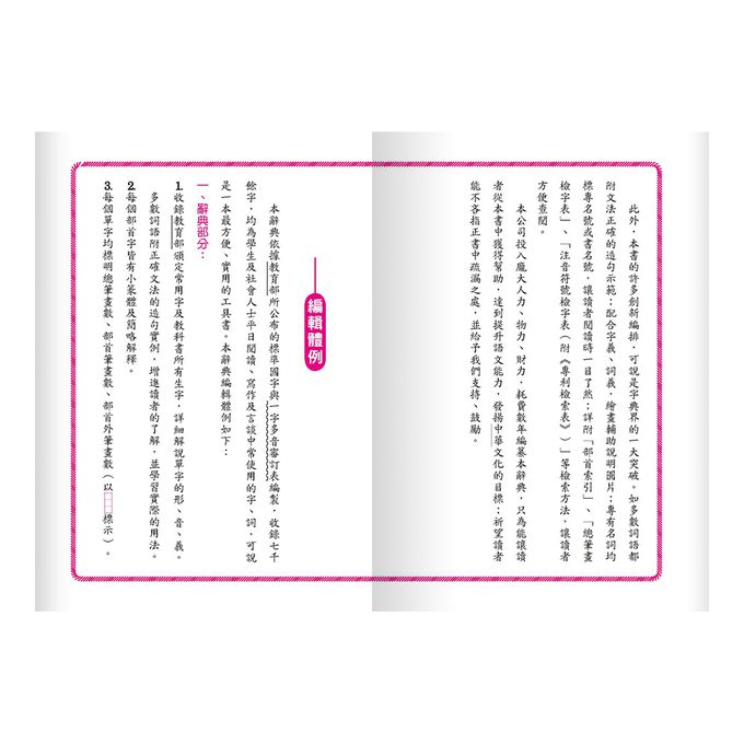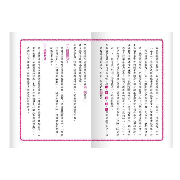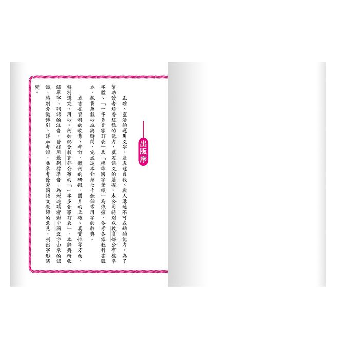 辭典收錄約七千字,依教育部頒布審訂的標準字體,標準國字筆順與一字多音審訂表編輯,各字注音完備,詞條廣博並多附例句,字體大,閱讀舒適,附三種檢索方式,並有漢語拼音及簡體字作對照,內容豐富實用,是您學習國語不可或缺的好幫手.