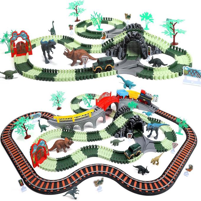 兒童擬真恐龍公園軌道吉普車與鐵道聲光火車套裝玩具259件組