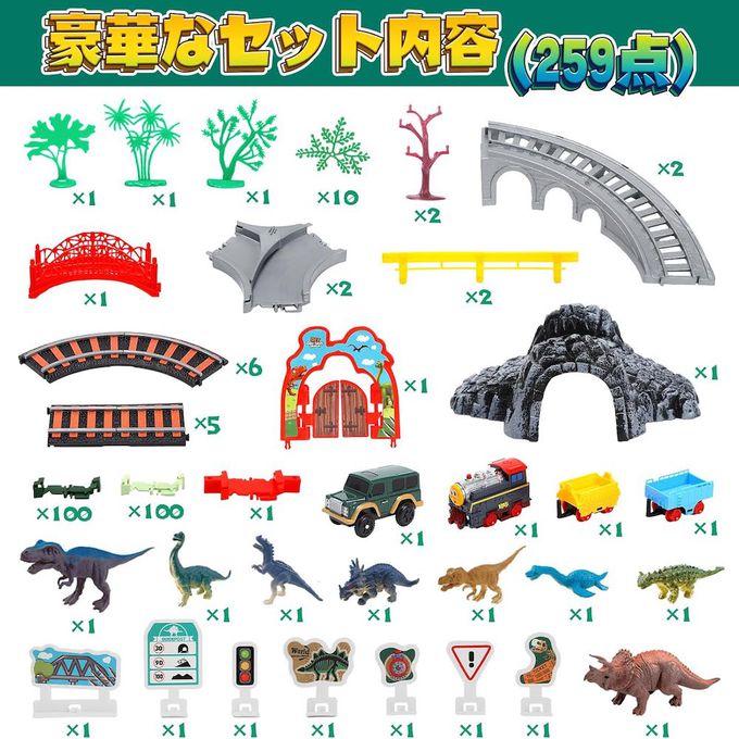 品名:兒童擬真恐龍公園軌道吉普車與鐵道聲光火車套裝玩具259件組