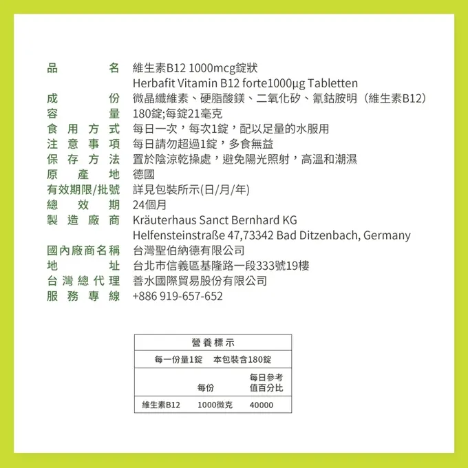 成分:微晶纖維素、硬脂酸鎂、二氧化矽、氰鈷胺明(維生素B12)