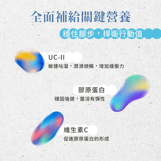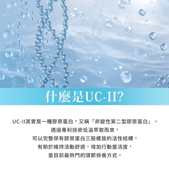 成分:抗壞血酸(維生素C)、微晶a-纖維素、明膠(牛來源) UC-II&(未變性II型膠原蛋白、氯化鉀)、硬脂酸