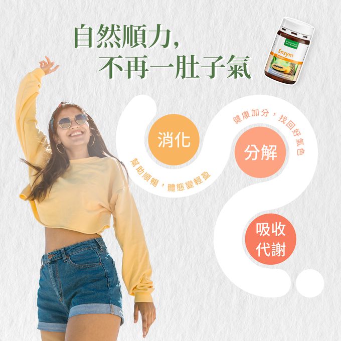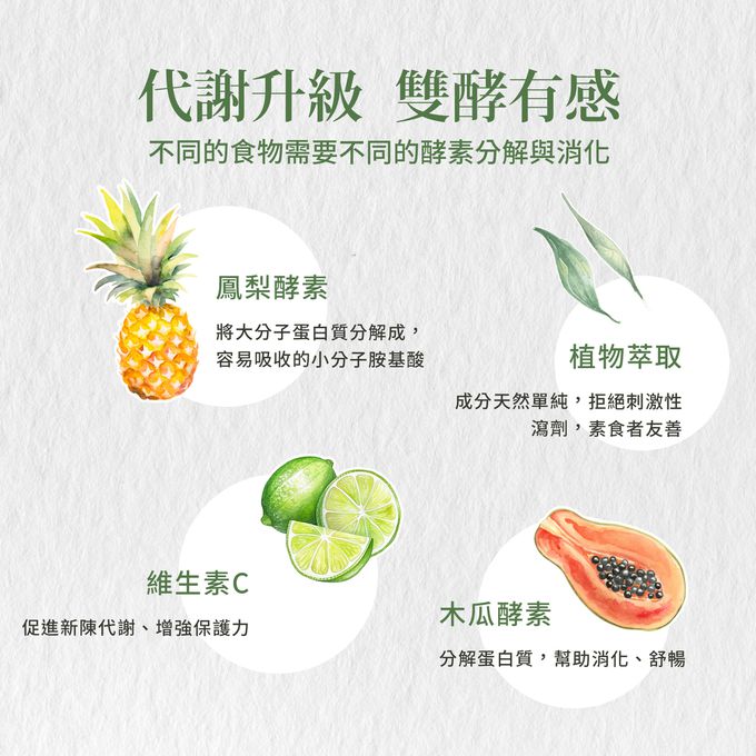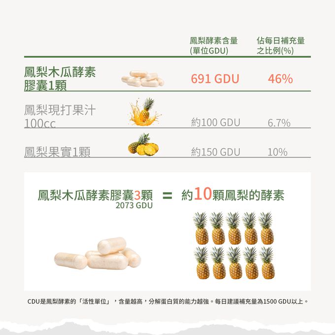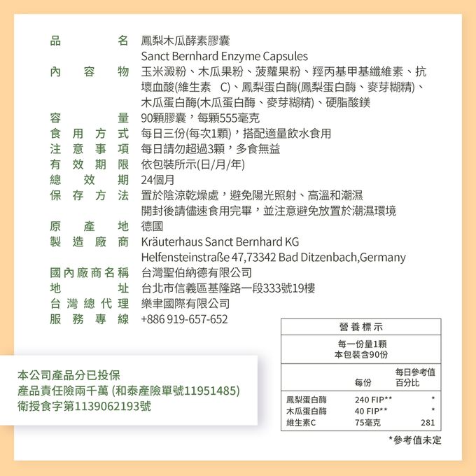 成分:米澱粉、木瓜果粉、菠蘿果粉、徑丙基甲基纖維素、抗壞血酸(維主素C)、鳳梨蛋白酶(鳳梨蛋白酶、麥芽糊精)、木瓜蛋白酶(木瓜蛋白酶、麥芽糊精)、硬脂酸鎂