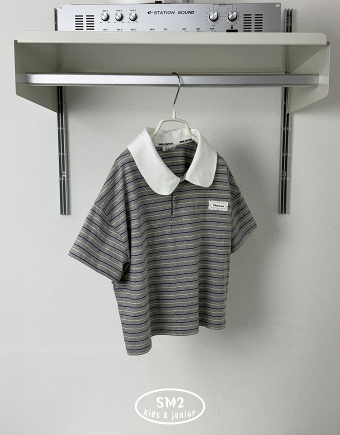韓國 sm2 - 學院風翻領條紋短袖上衣-灰