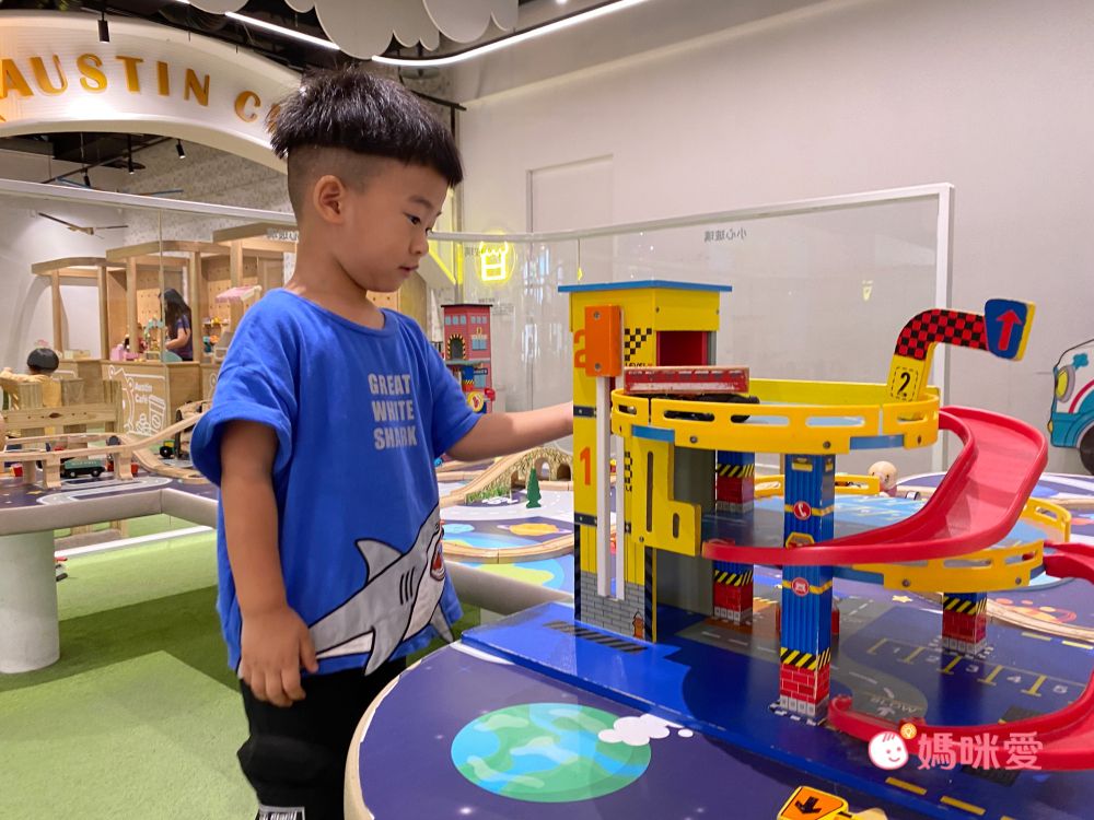 也有在地面的拼接軌道,像這樣主題明確的玩車區真的很難得,也才讓我們知道,原來兒子能在這個時候特別專注,他可以一個人和這些車玩好久耶!