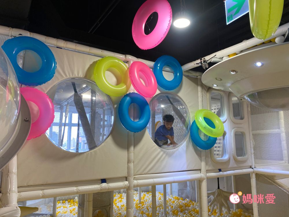 裡面更是別有洞天! 好多小巧思都放在太空艙裡了,有可以彈跳的空間、平衡協調的立體鞦韆、各式攀爬機關,放電的其中一部份就是靠這區了!哈哈