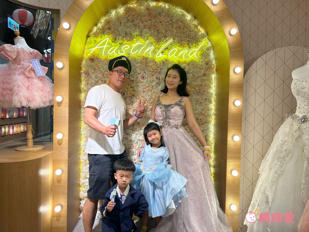 換完還有頭紗、髮飾小皇冠👑可以戴上,爸爸看到都要哭了,不可能才五歲就穿婚紗吧!哈哈哈,王美在這裡換了超多套~店內還有美美的花牆可以擺拍~