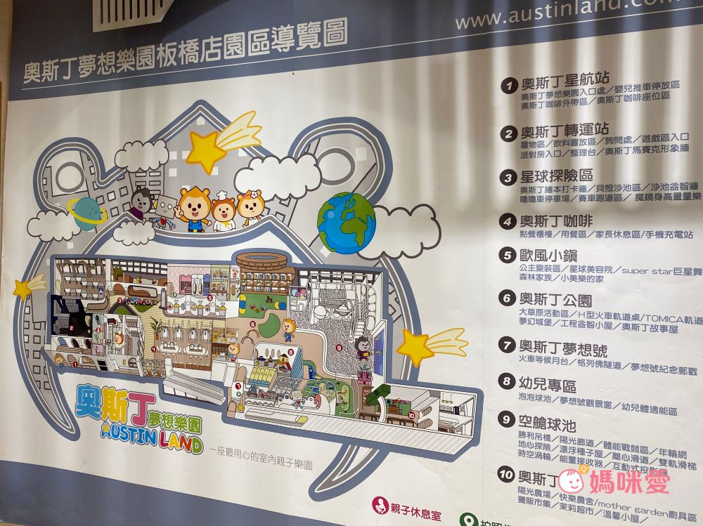 擁有240 坪超大空間的奧斯丁夢想樂園-板橋麗寶店,裡面劃分出了10個場域,裏面包含了7個專屬遊戲區、服務與餐飲區,能滿足所有大小朋友遊樂休閒的需求,入口有基本的售票與服務櫃檯外,也提供嬰兒推車的停放處,便於家長們使用。