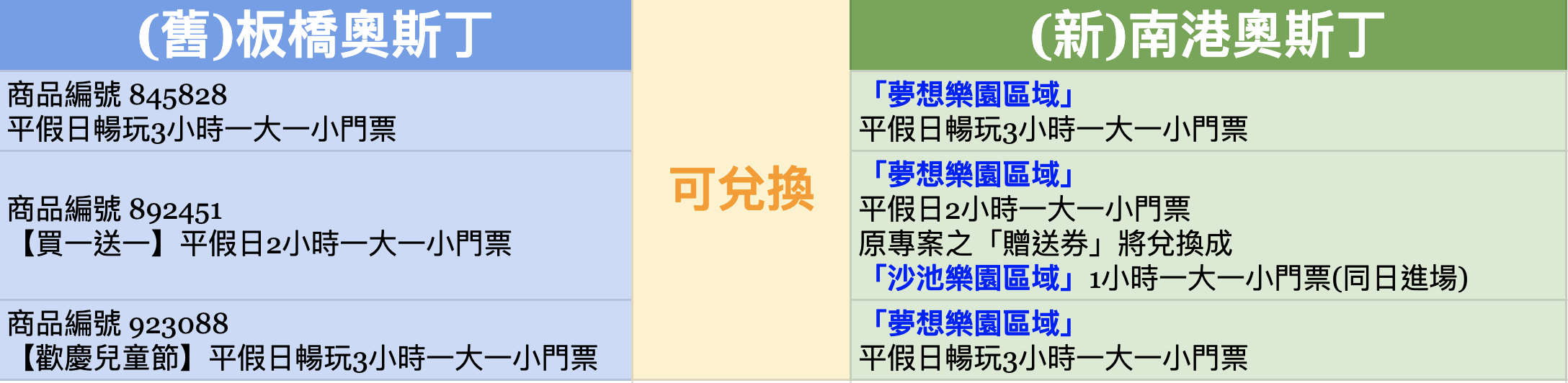 2. 商品編號 892451【買一送一】平假日2小時一大一小門票 可兌換 「南港奧斯丁」夢想樂園區域平假日2小時一大一小門票 + 原專案之「贈送券」將兌換成沙池樂園區域1小時一大一小入場(同一天兌換完畢,不會再提供贈送券)