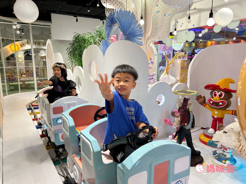 每個整點會發一次車,只要憑入場券就能免費搭乘一次喔!小小的繞圈也讓他們搭得好開心,而且還是奧斯丁當車長呢! 一趟可以繞兩圈,好可愛☺️