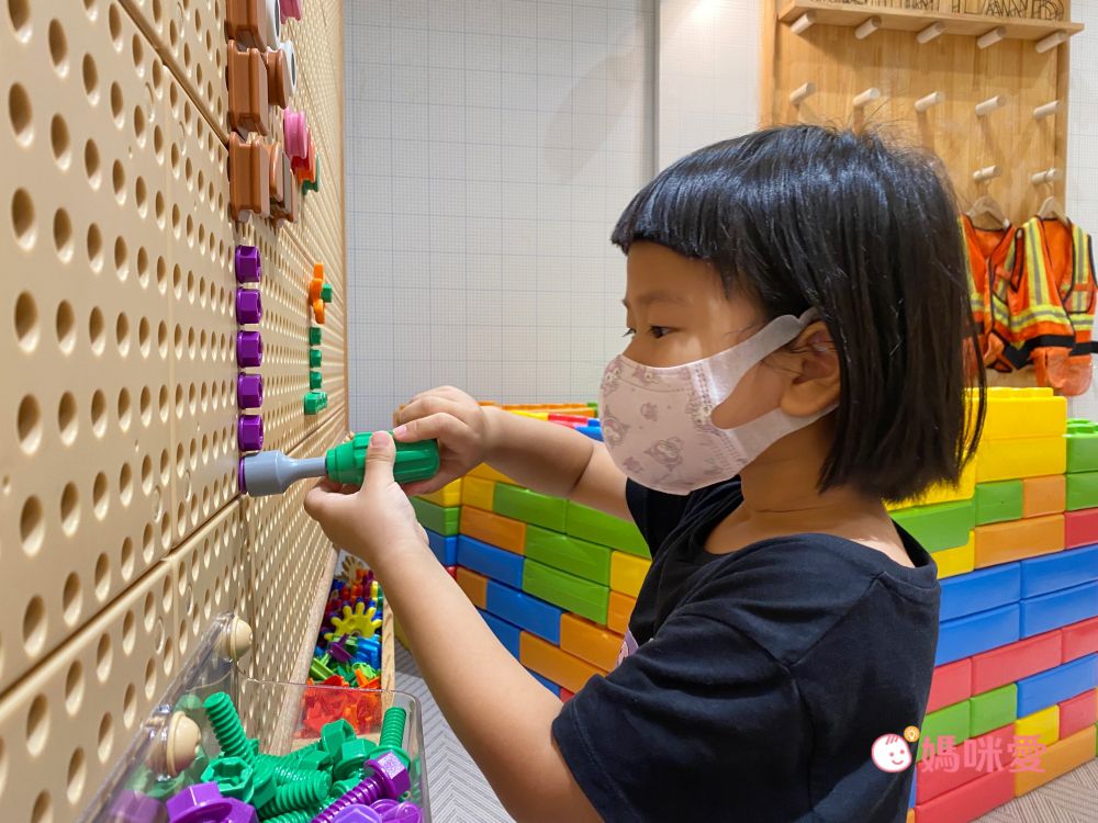 擁有空間感和創造力、想像力的小朋友在這裡可以獲得發揮空間,還有大積木能拼組堆疊,換上工程裝,當一個小小工程師吧!👷