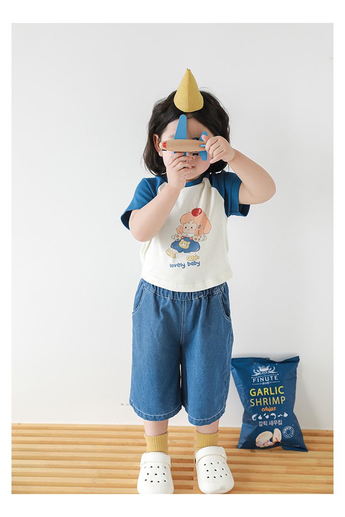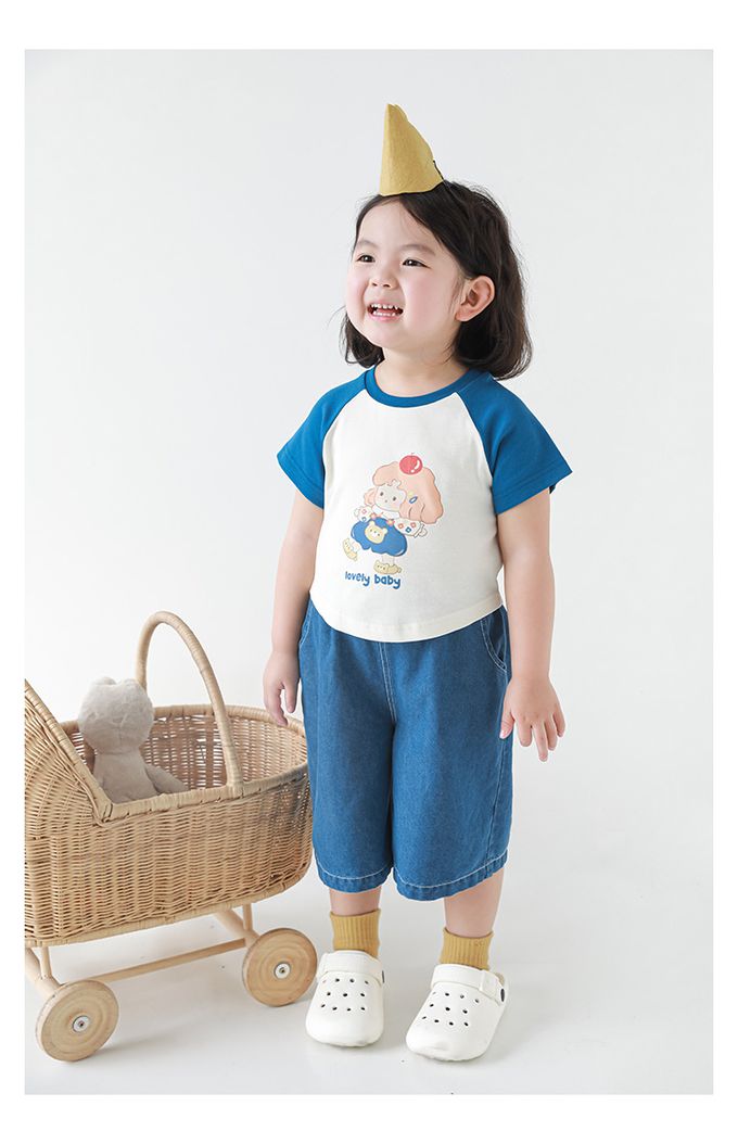 圓領拼色短袖上衣-可愛女孩-藍色袖