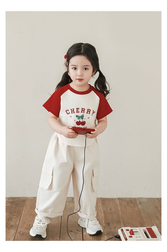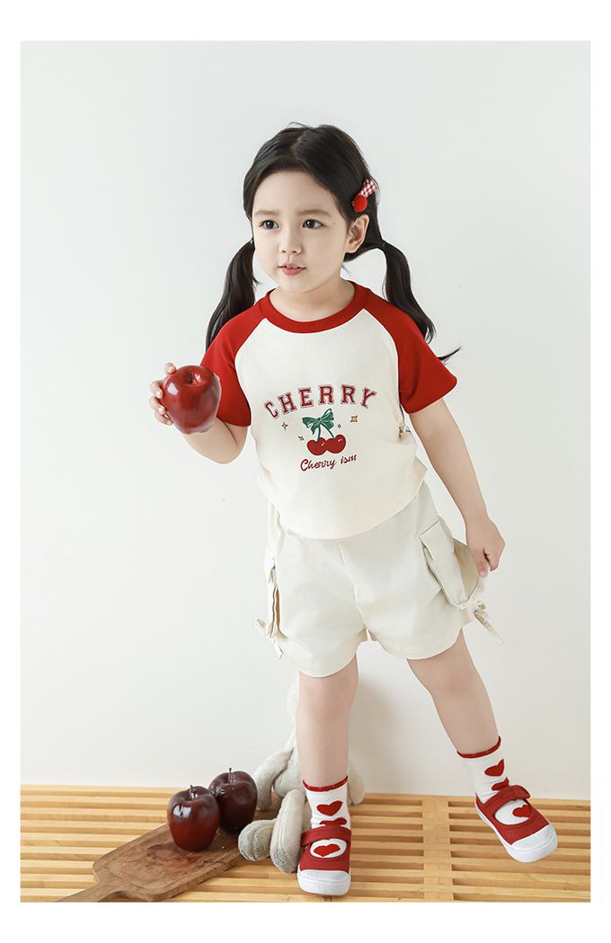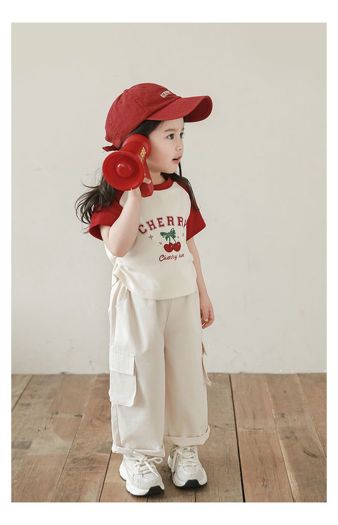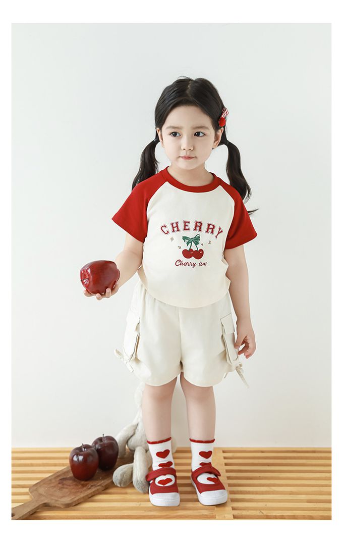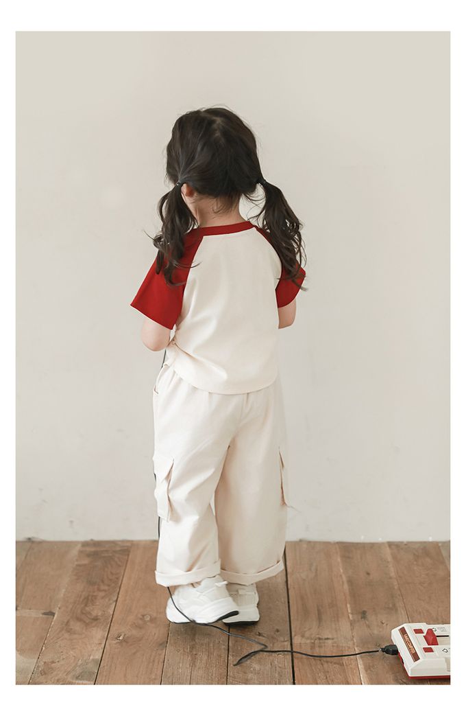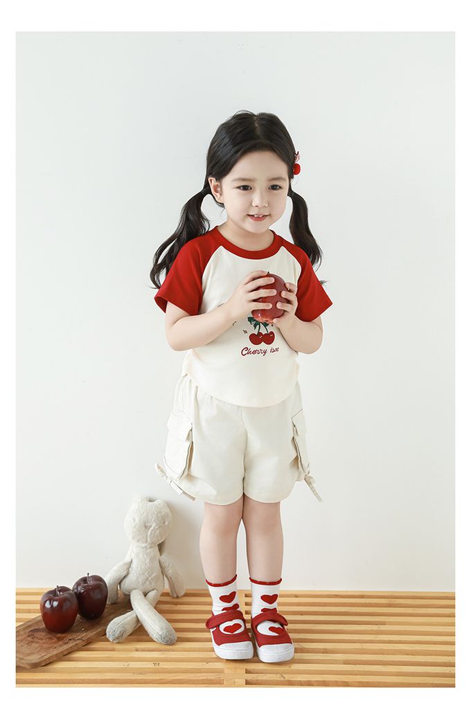 圓領拼色側抓皺短袖上衣-櫻桃-紅色