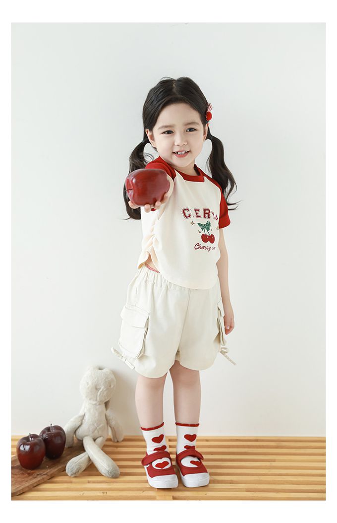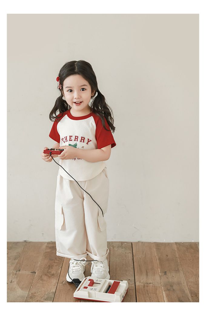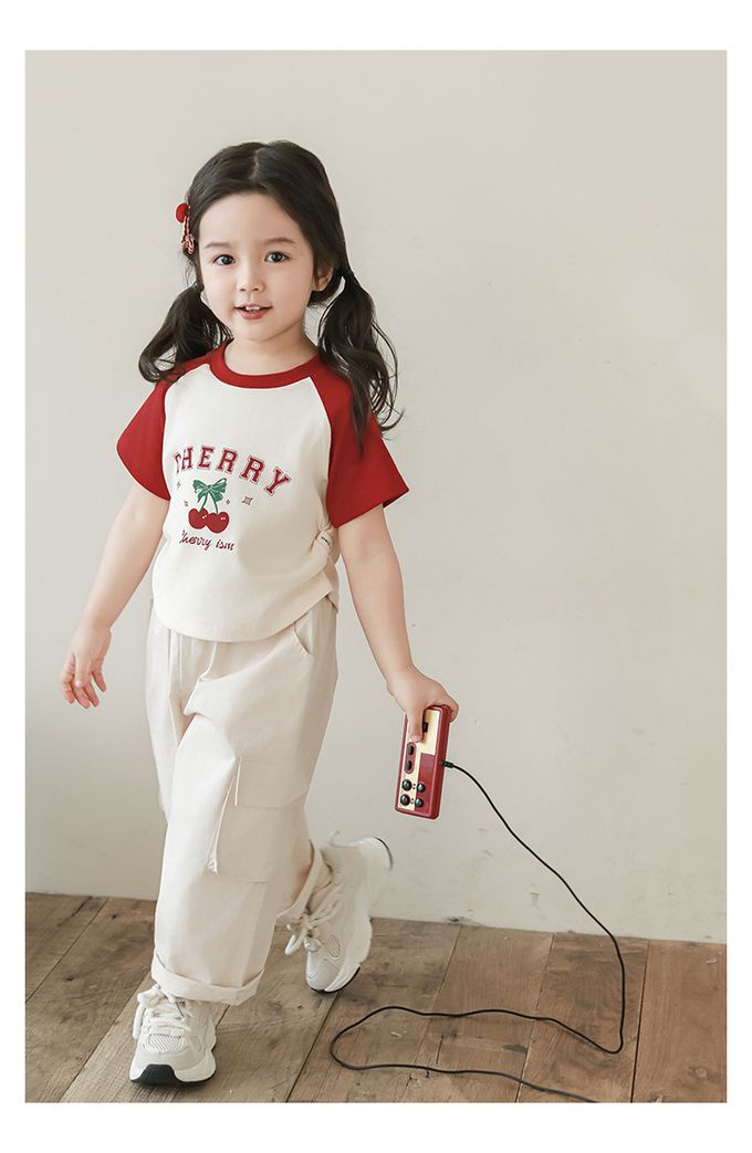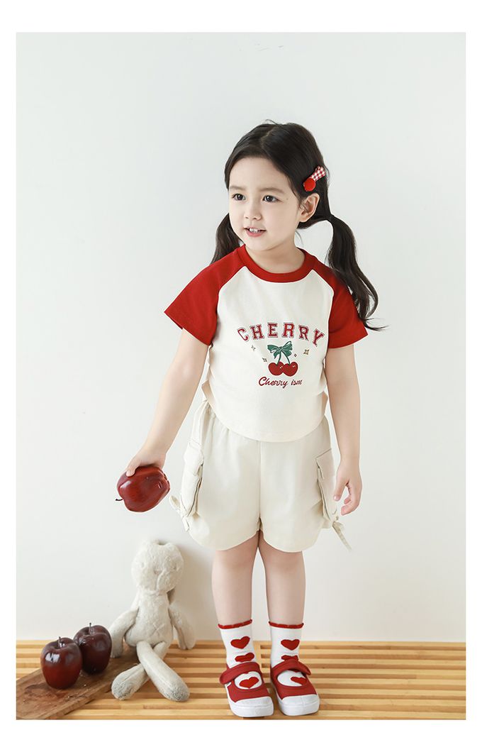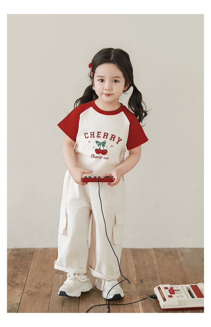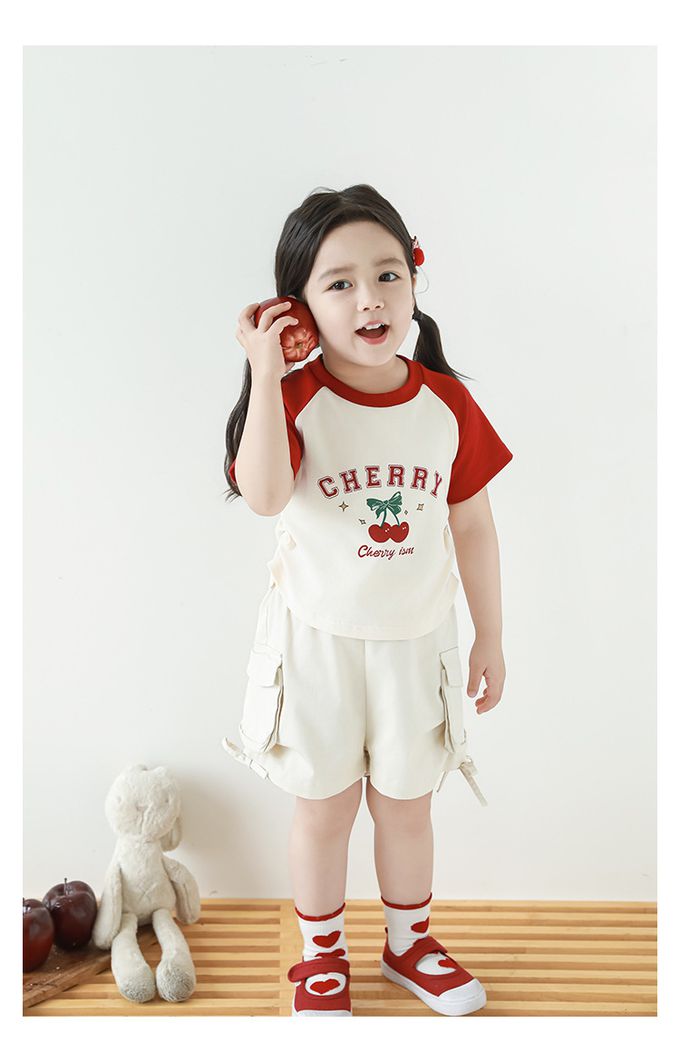 圓領拼色側抓皺短袖上衣-櫻桃-紅色