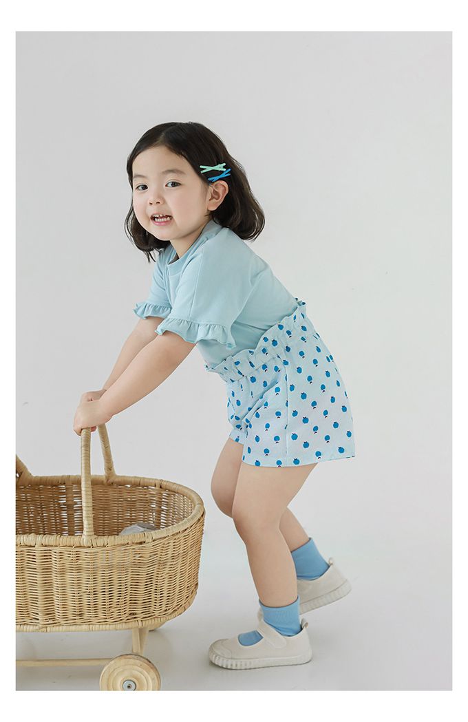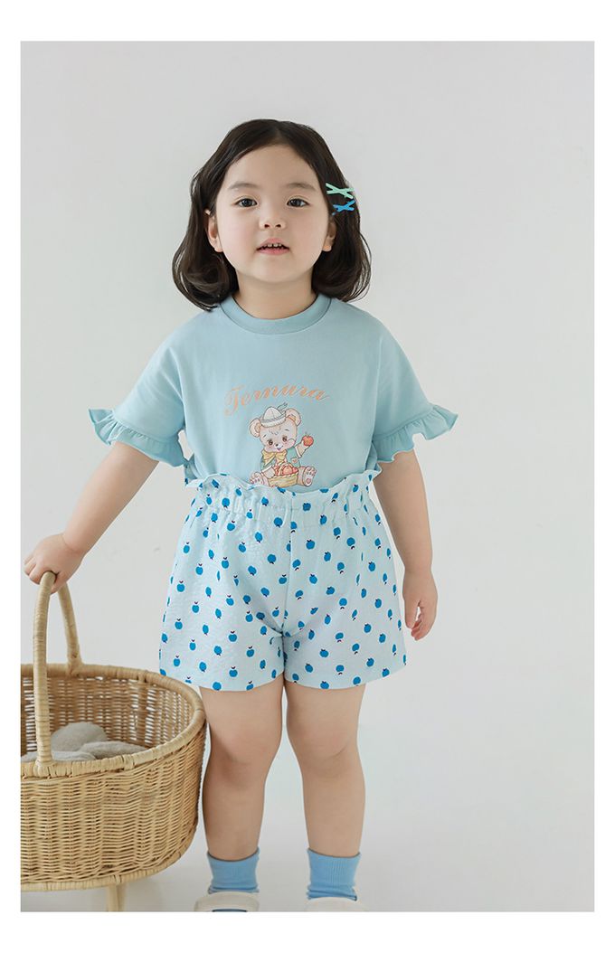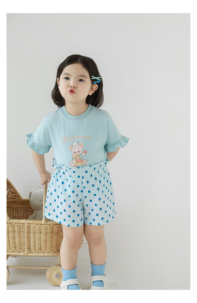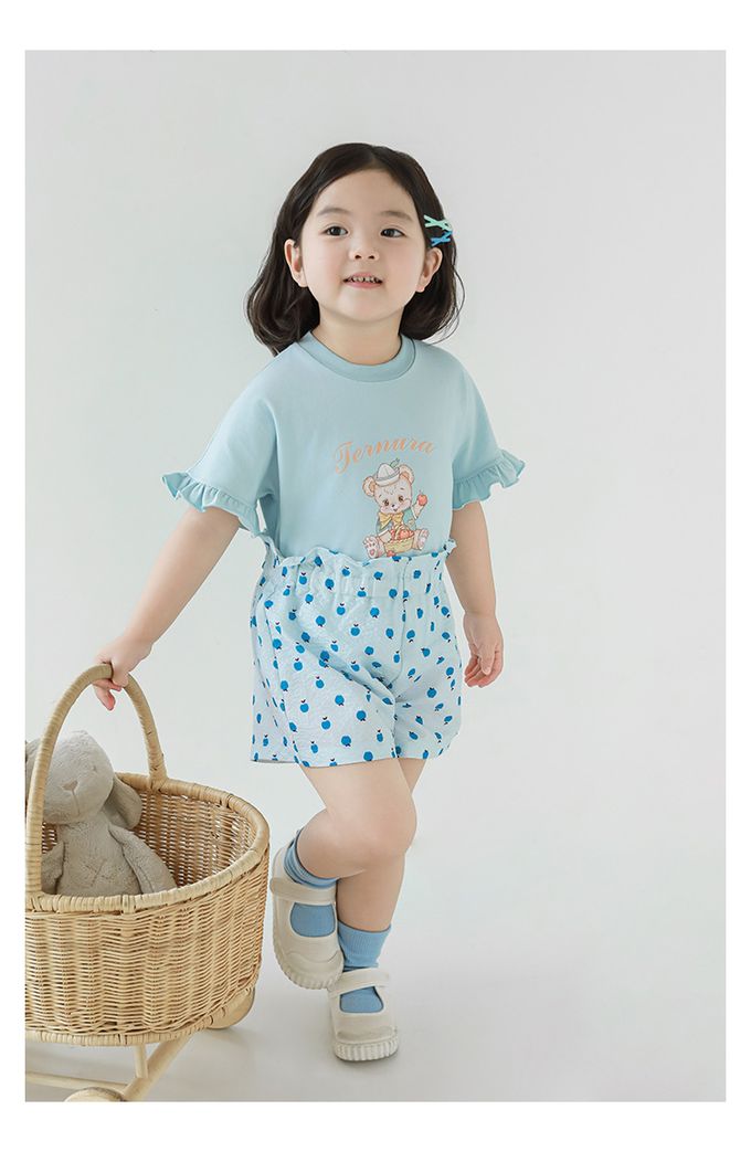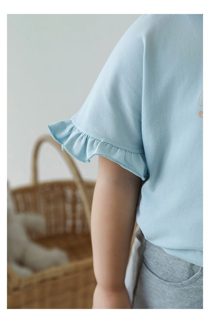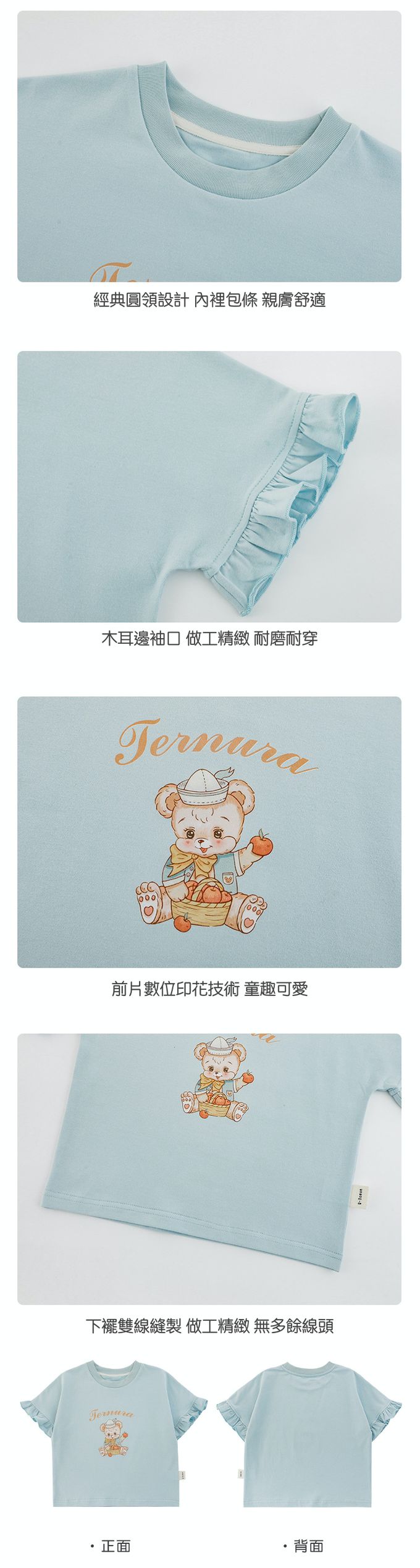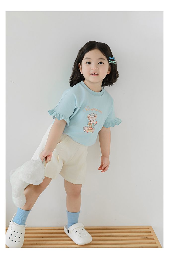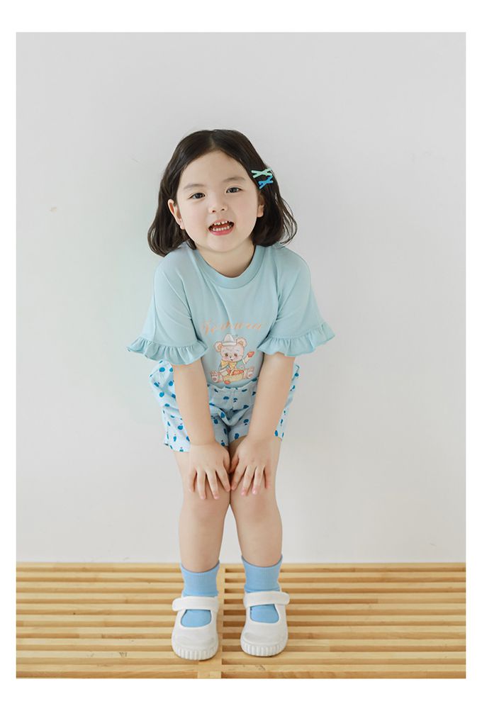 圓領木耳邊短袖上衣-小熊-藍色