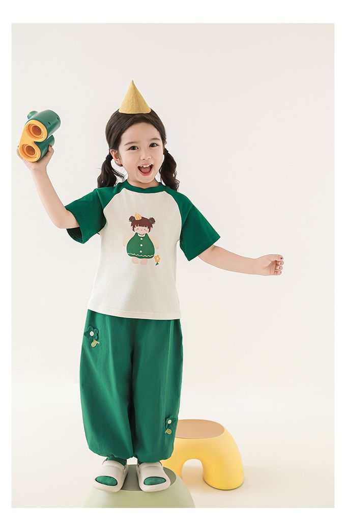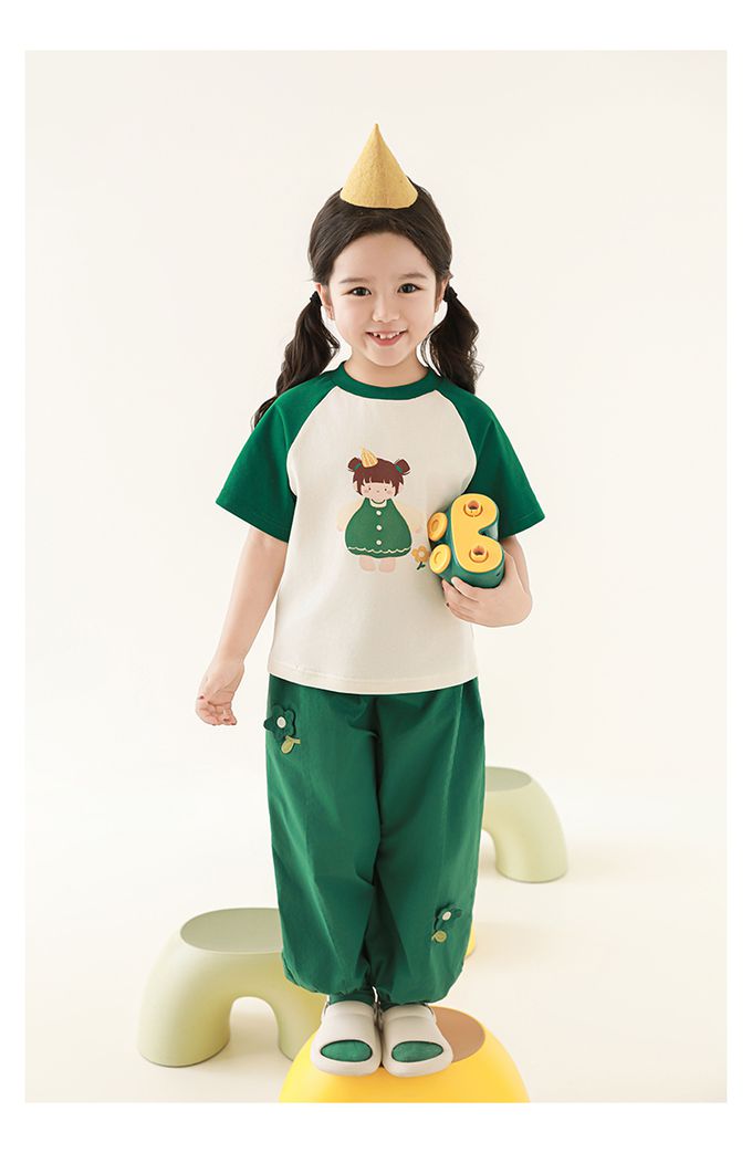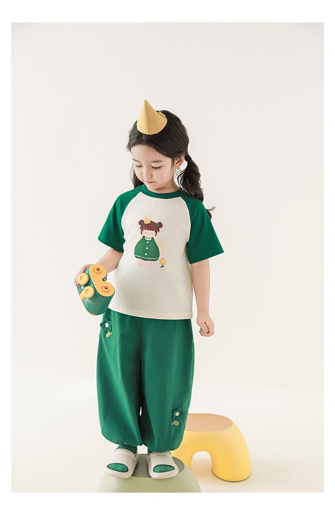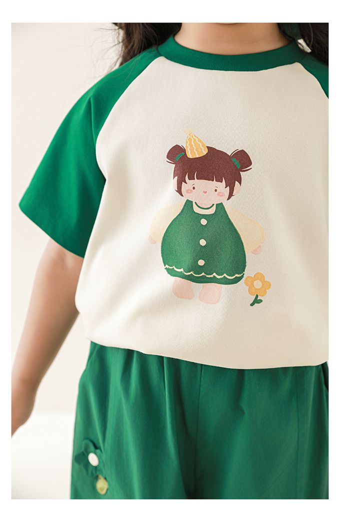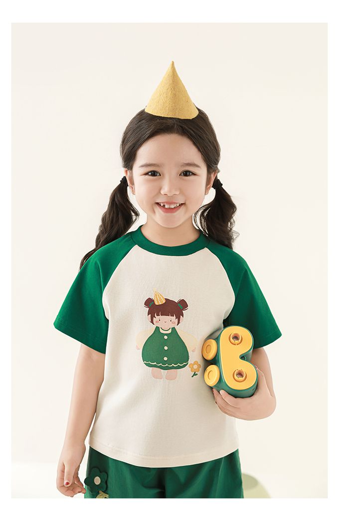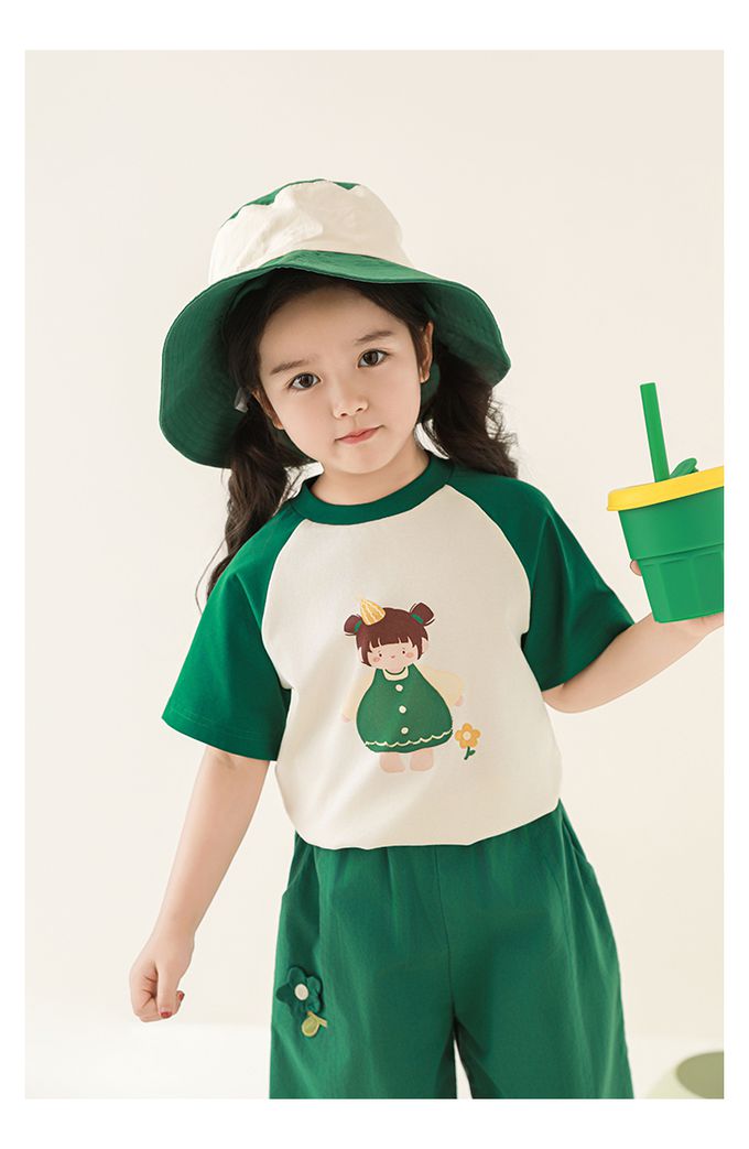 圓領微寬鬆拼色短袖上衣-萌萌女孩-深綠