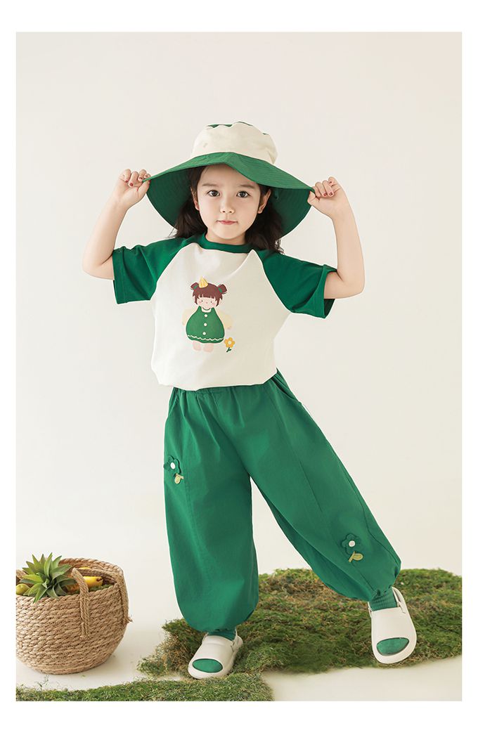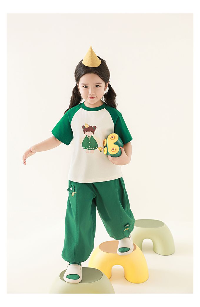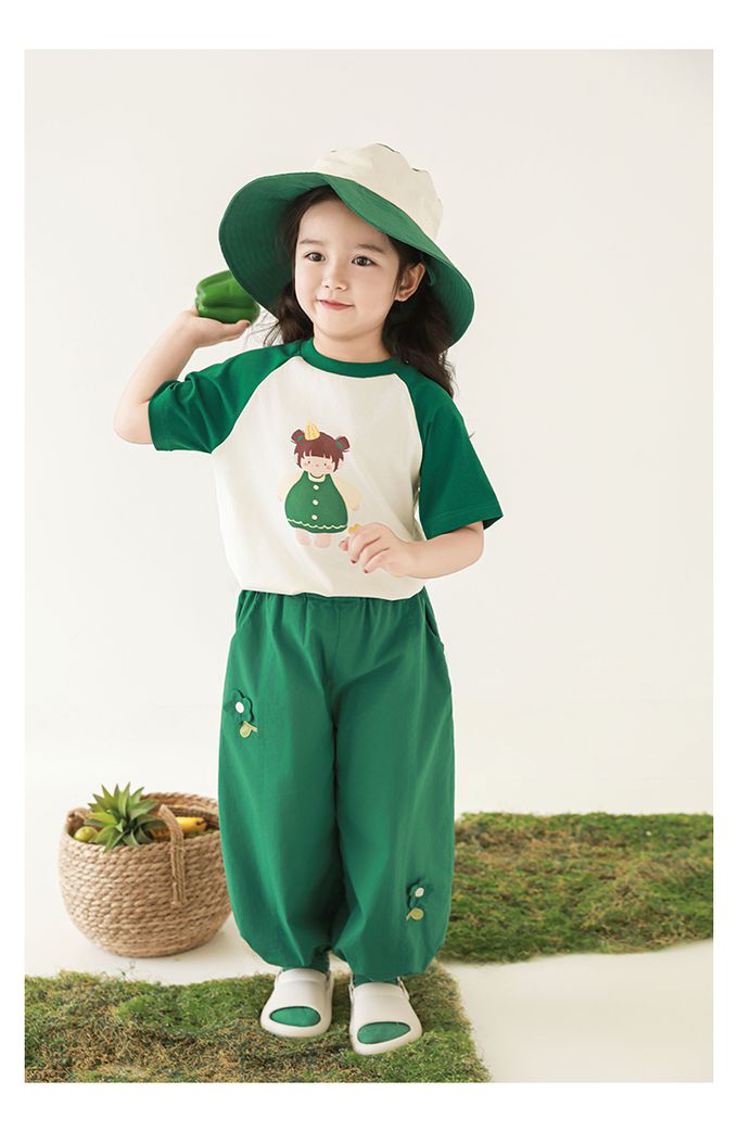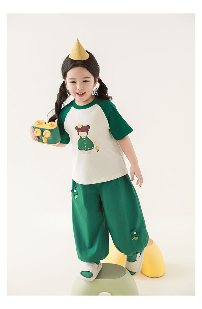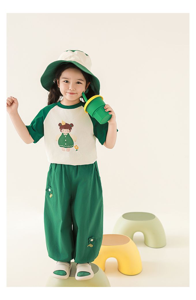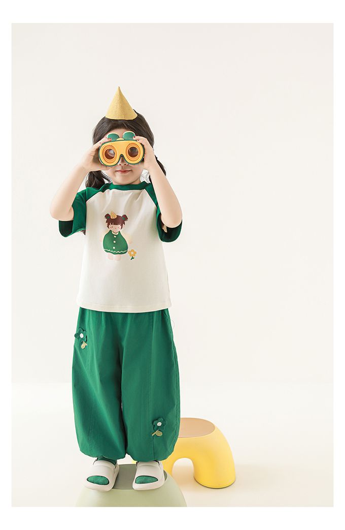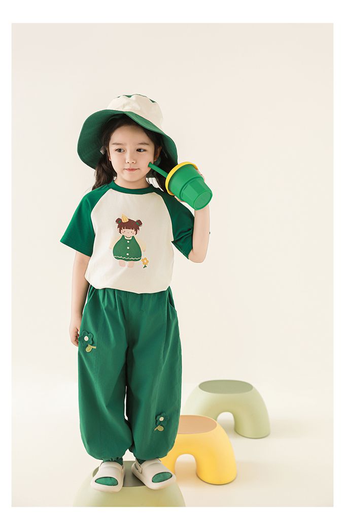 圓領微寬鬆拼色短袖上衣-萌萌女孩-深綠