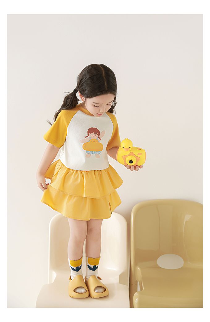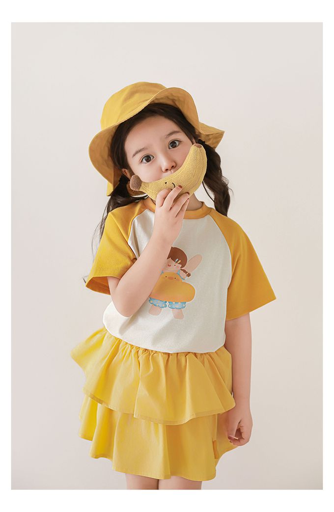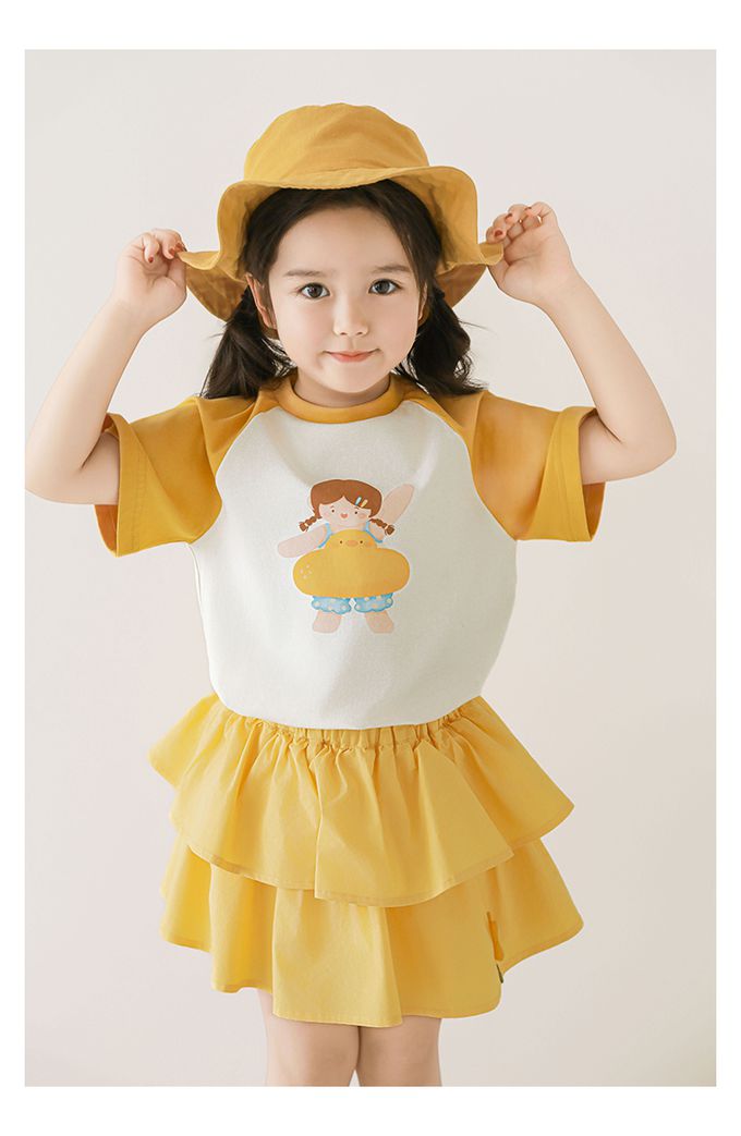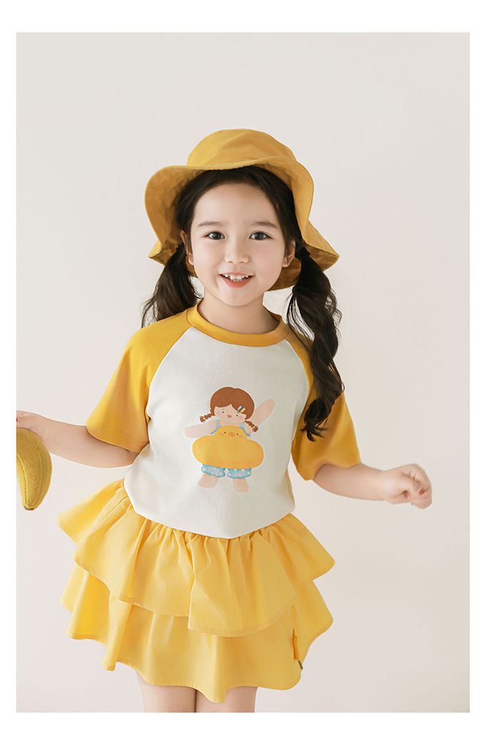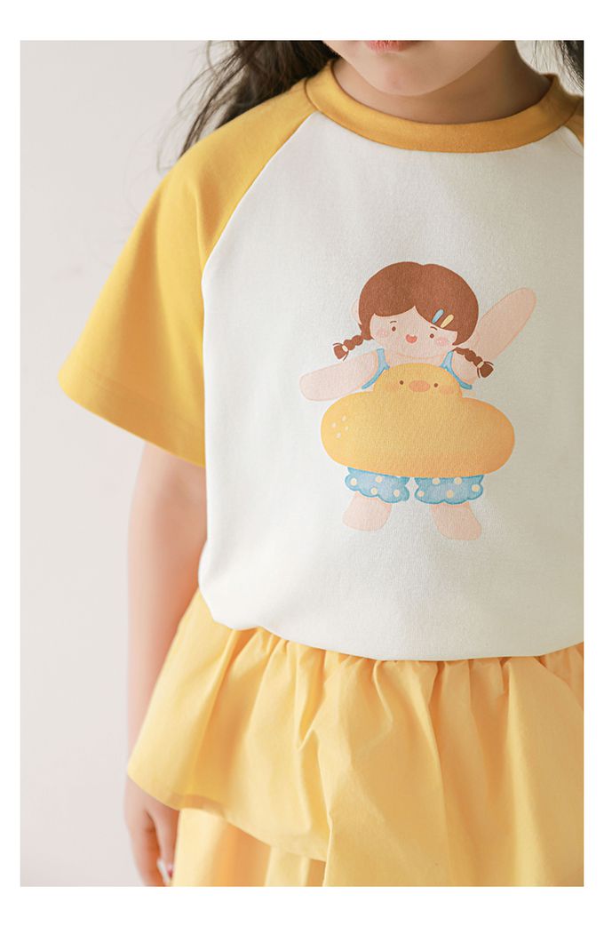 圓領微寬鬆拼色短袖上衣-萌萌女孩-黃色