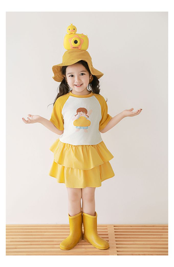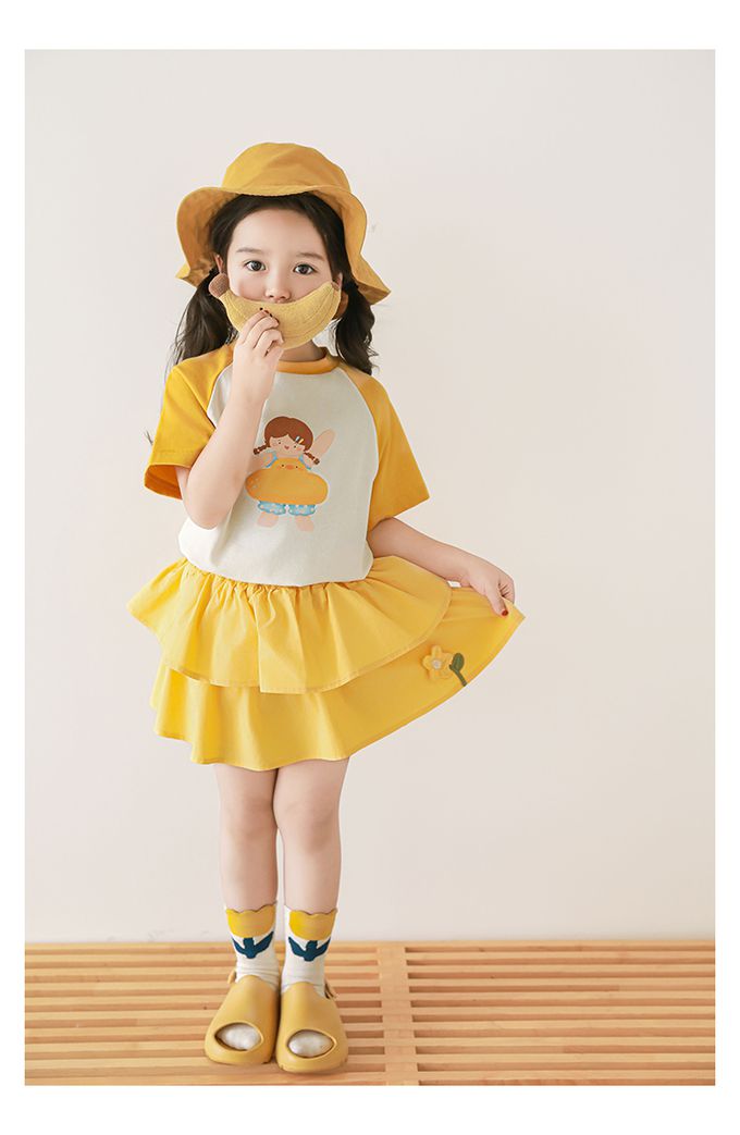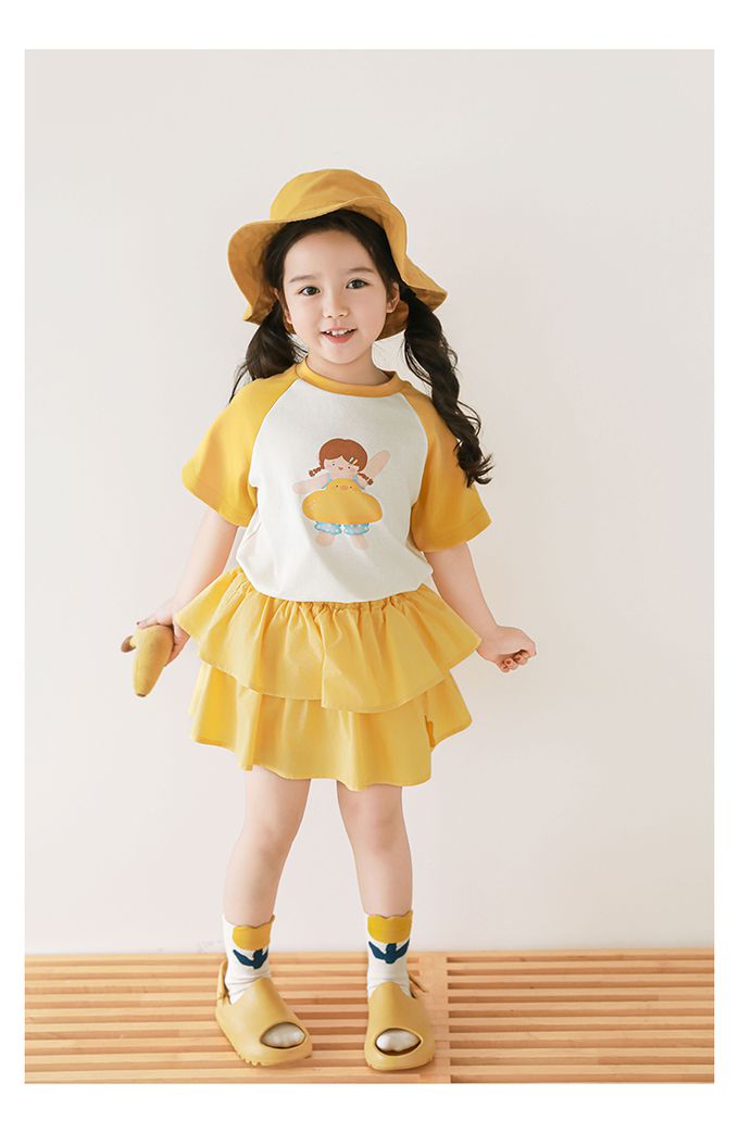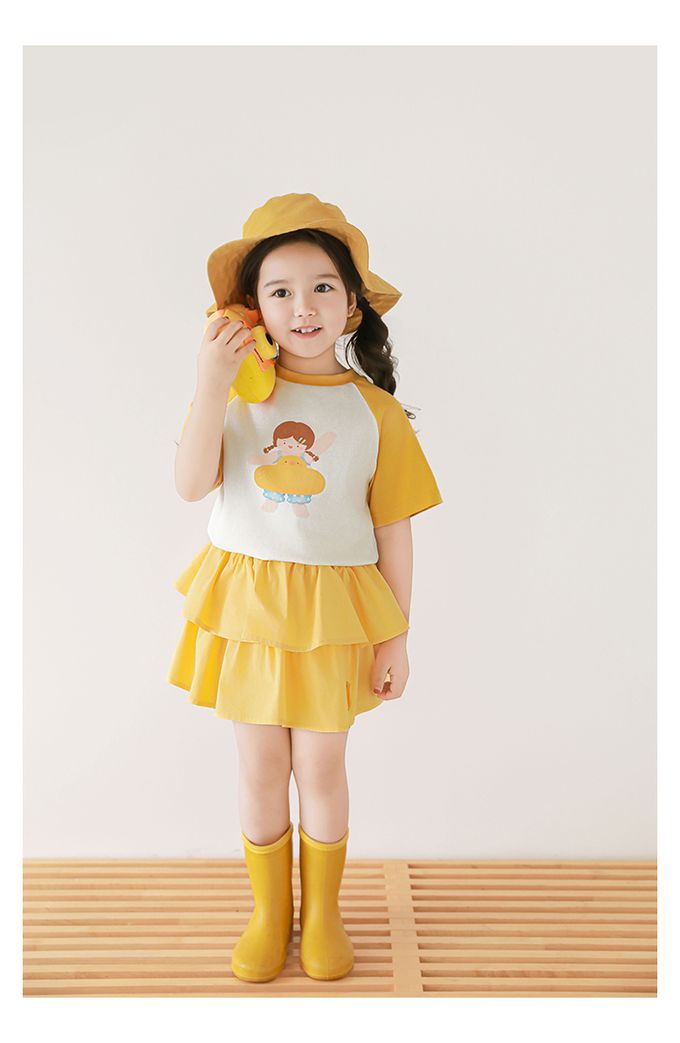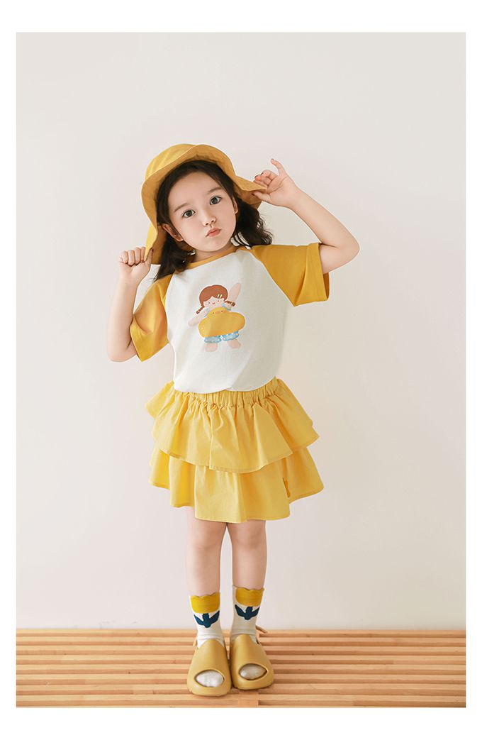 圓領微寬鬆拼色短袖上衣-萌萌女孩-黃色