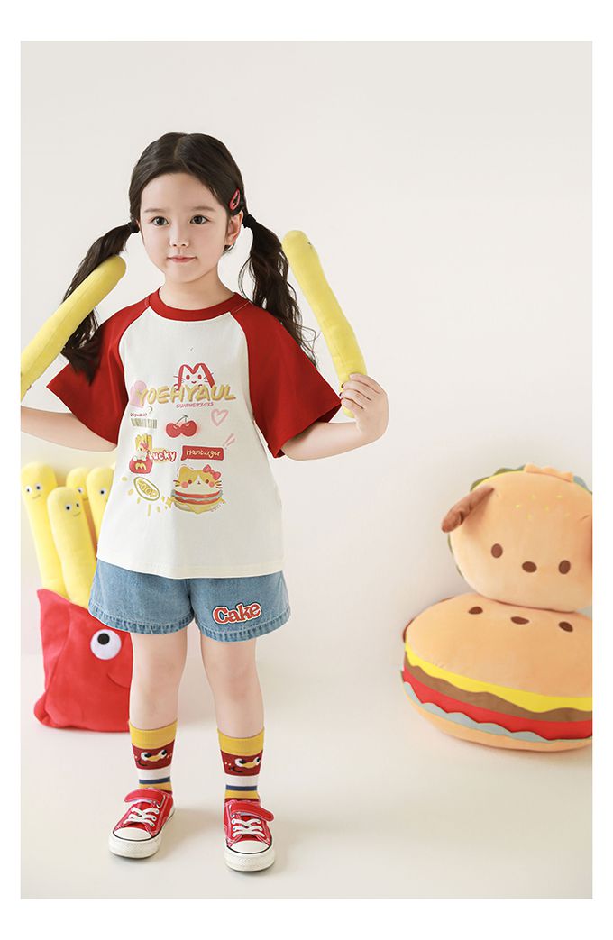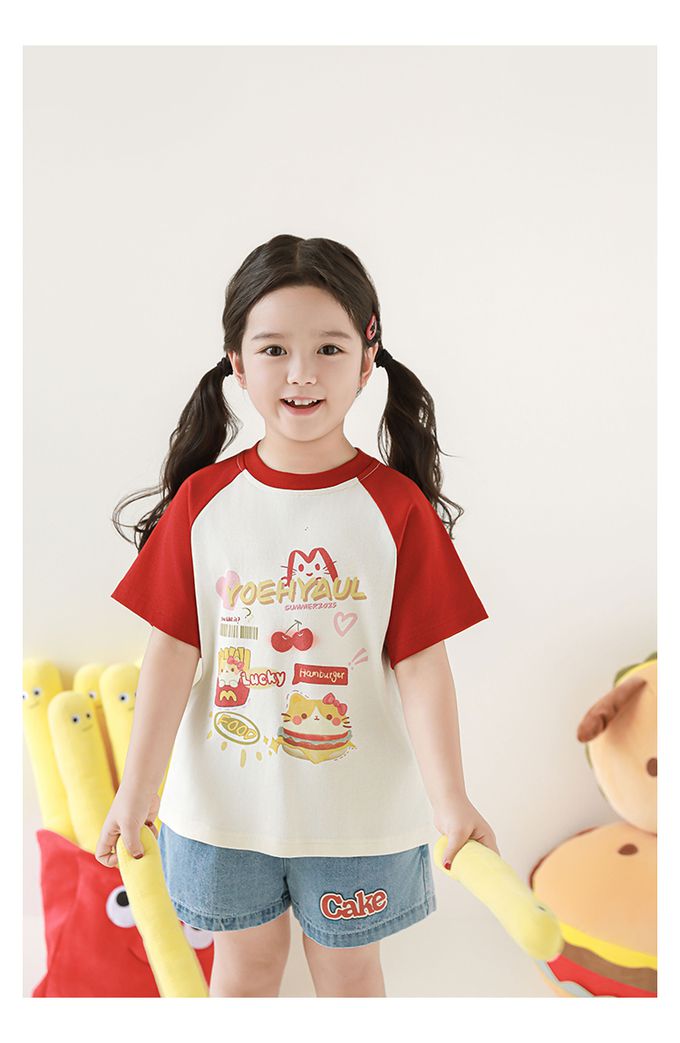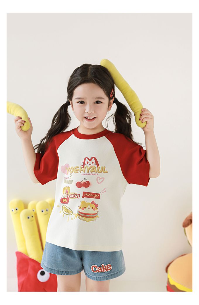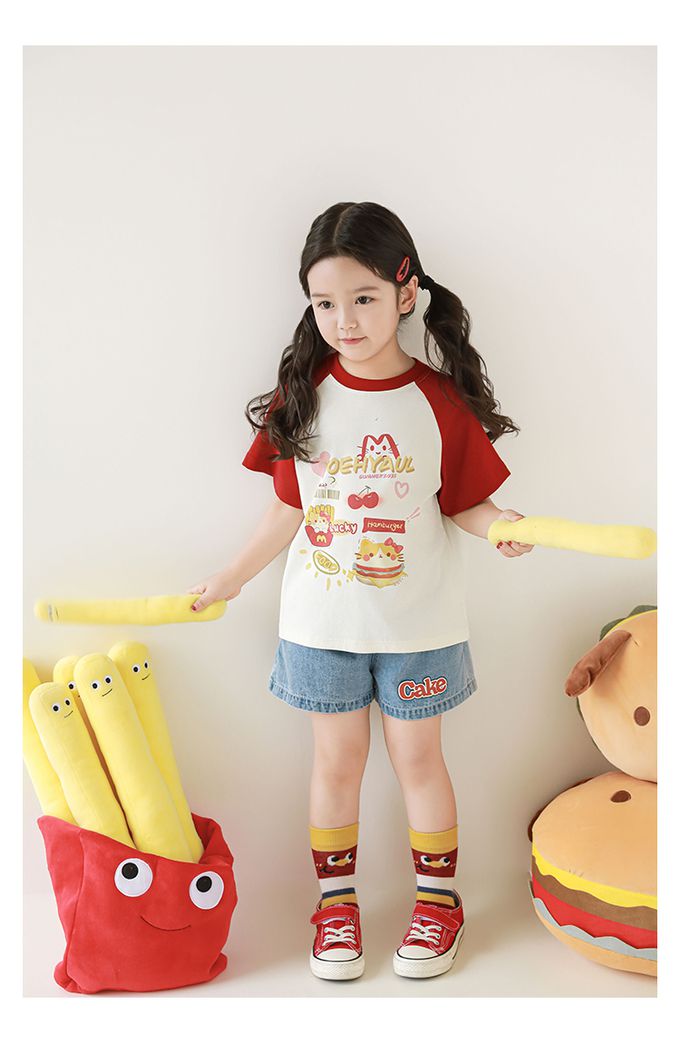 圓領拼色短袖上衣-速食貓咪-米x紅