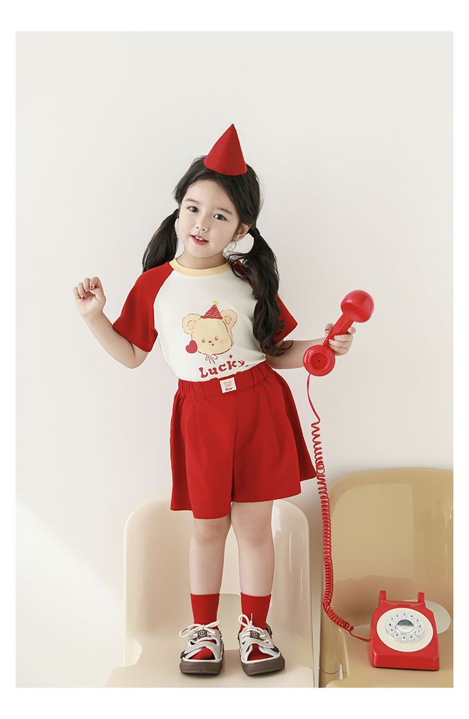 圓領拼色短袖上衣-幸運小熊-米x紅