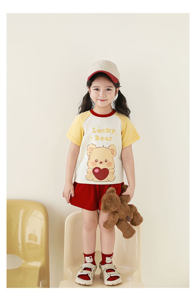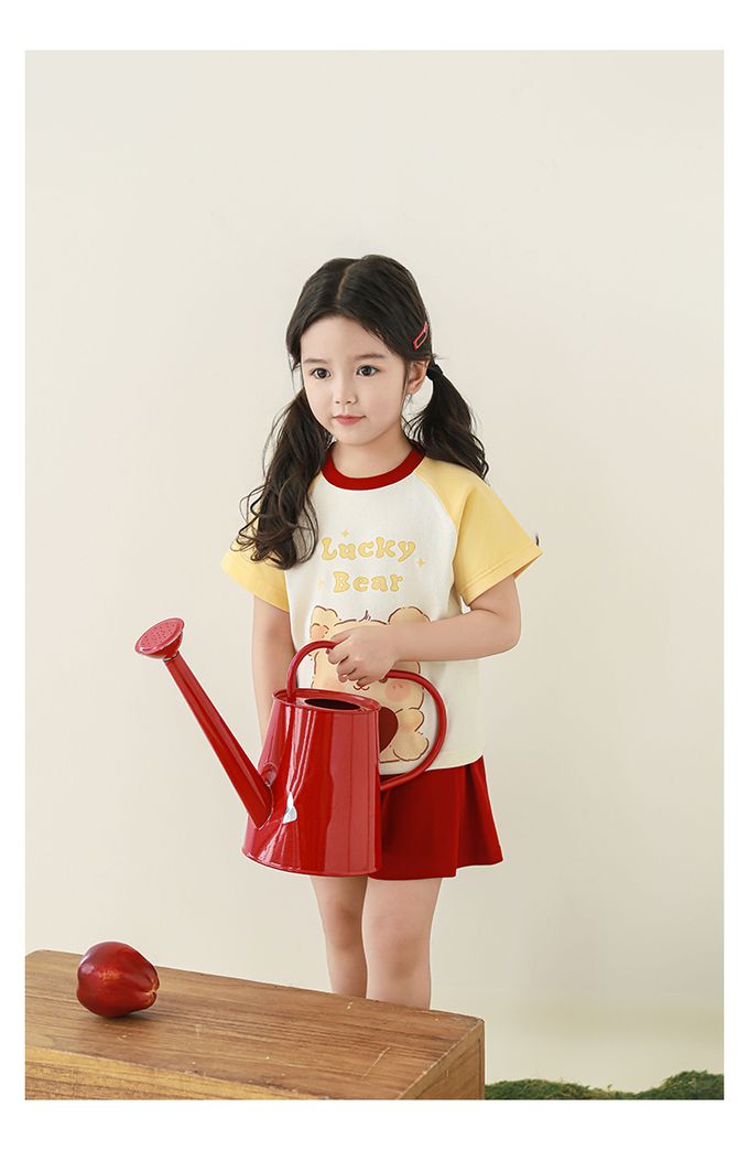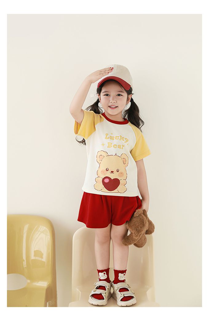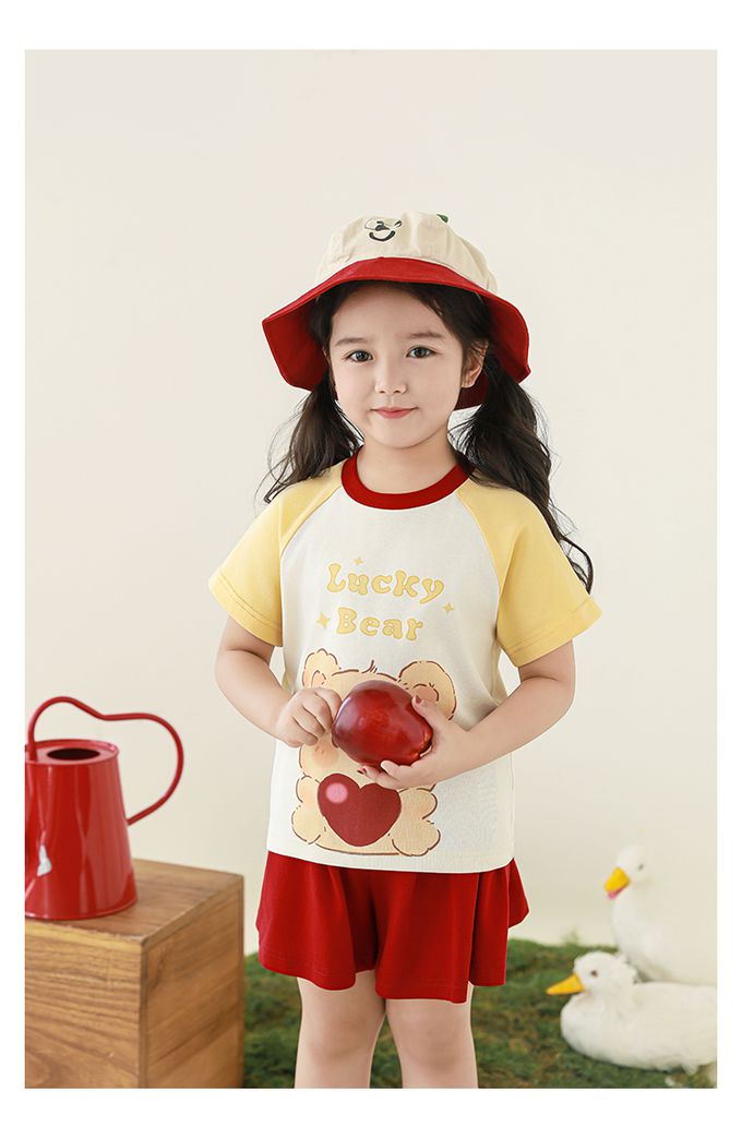 圓領拼色短袖上衣-幸運小熊-米x黃