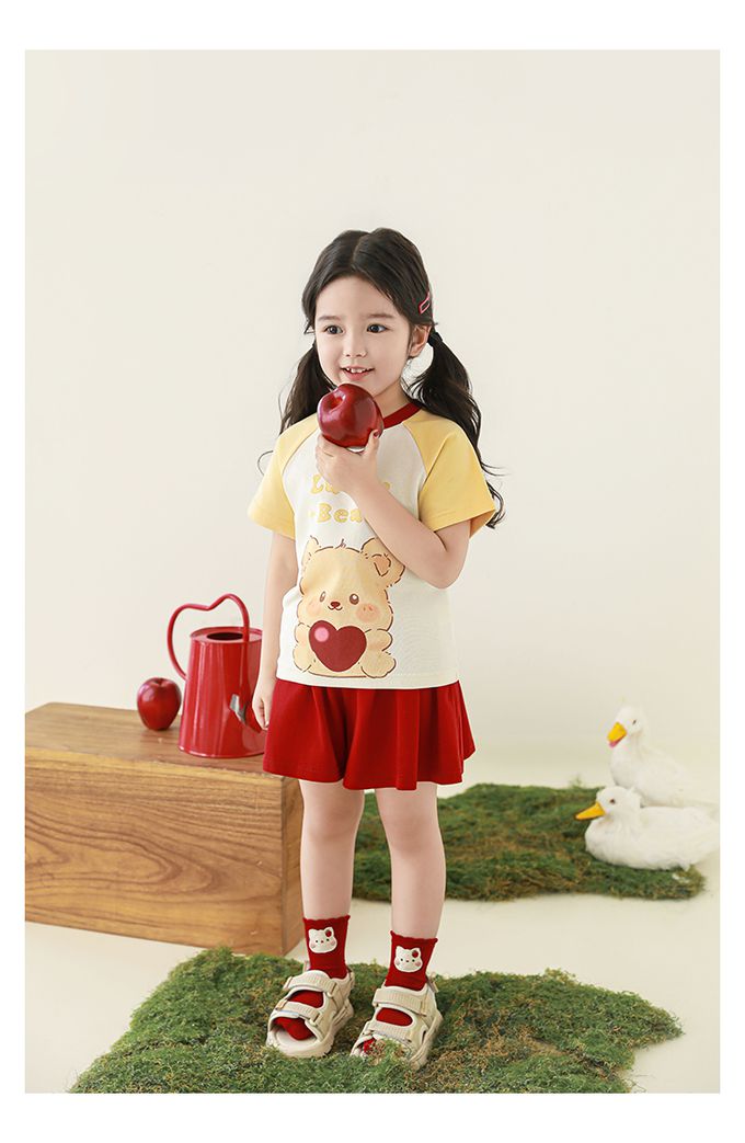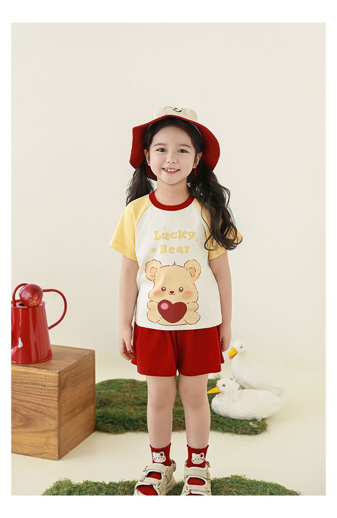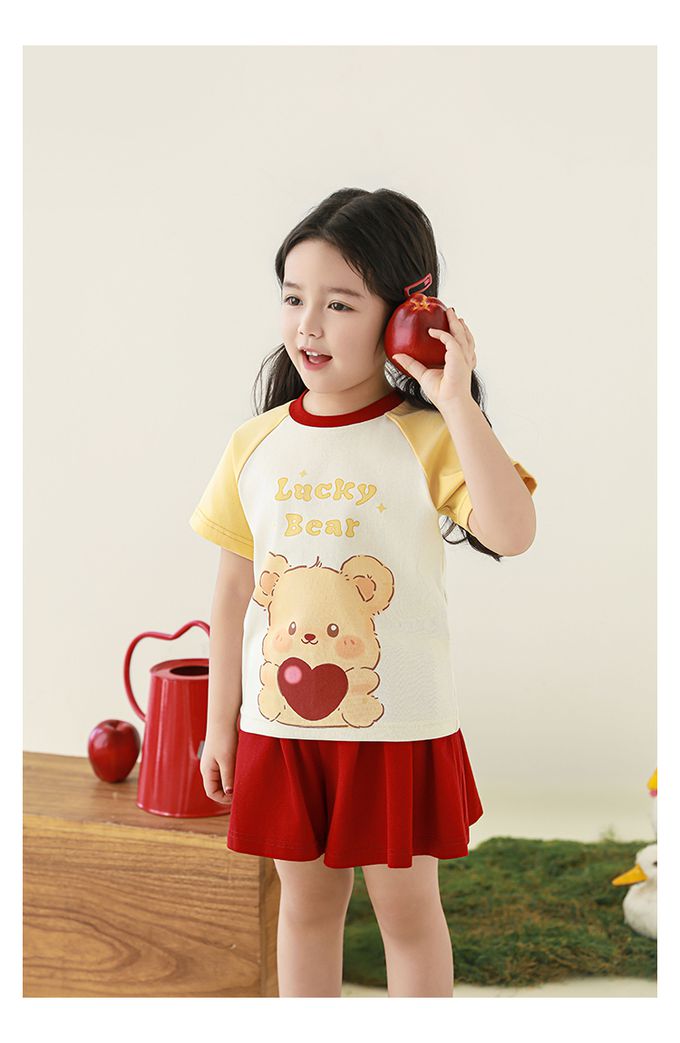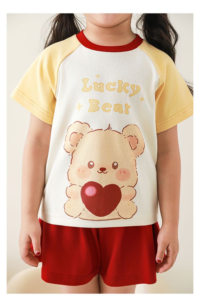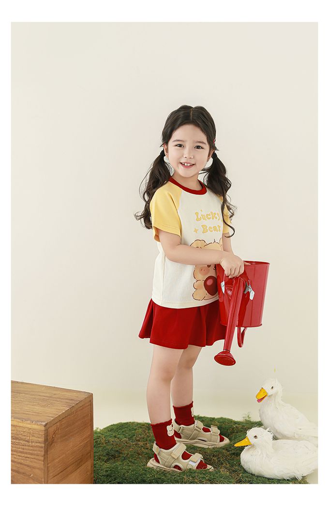 圓領拼色短袖上衣-幸運小熊-米x黃
