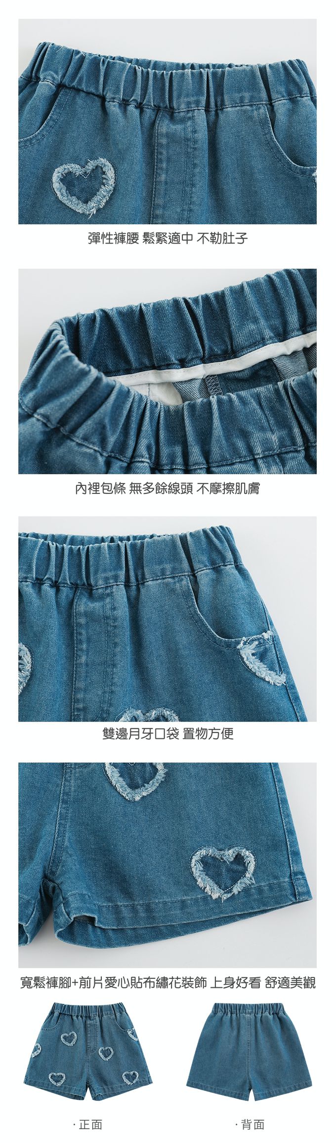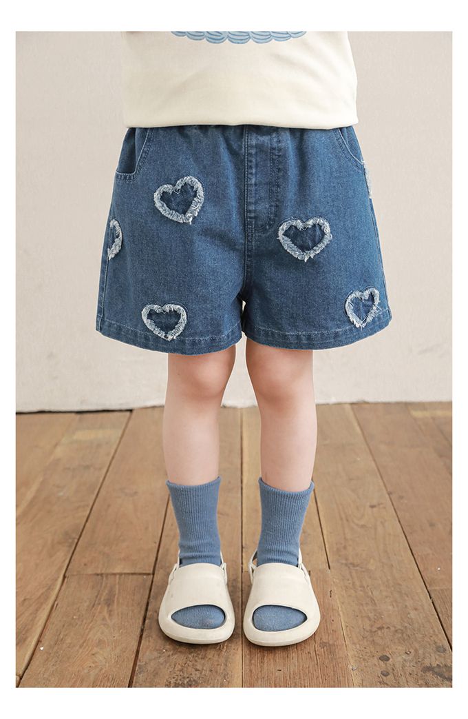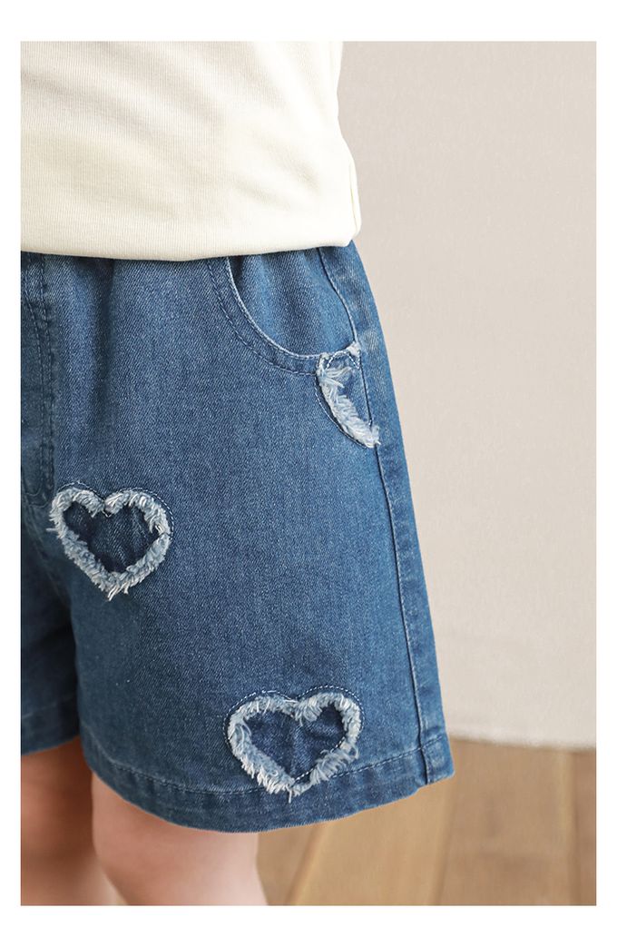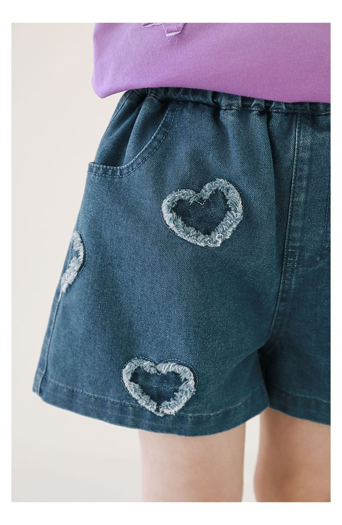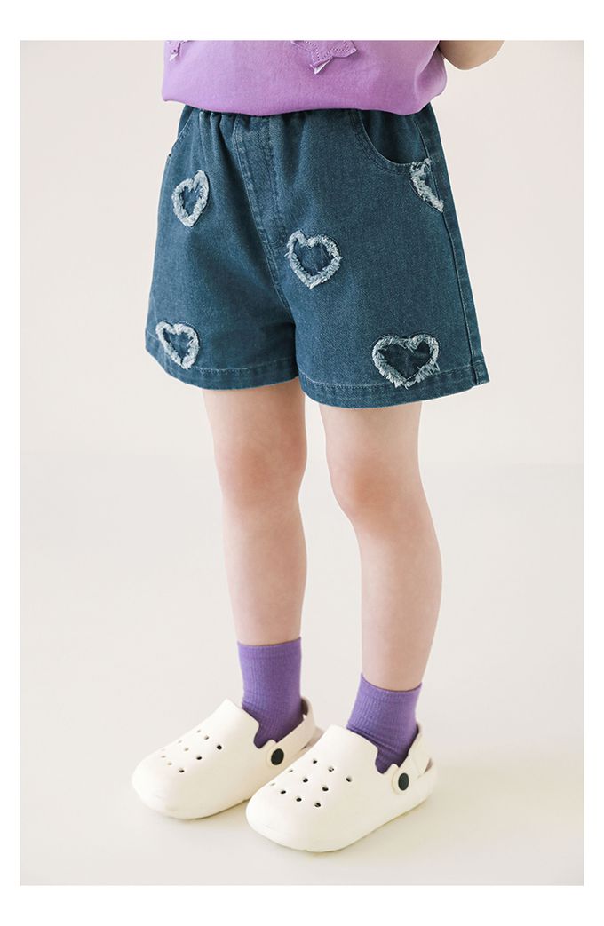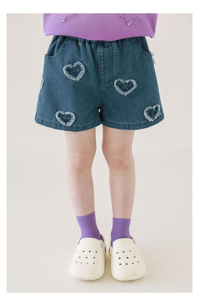 腰鬆緊牛仔休閒短褲-毛邊愛心-藍色
