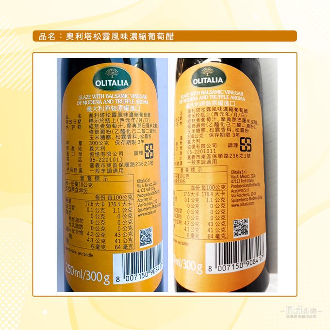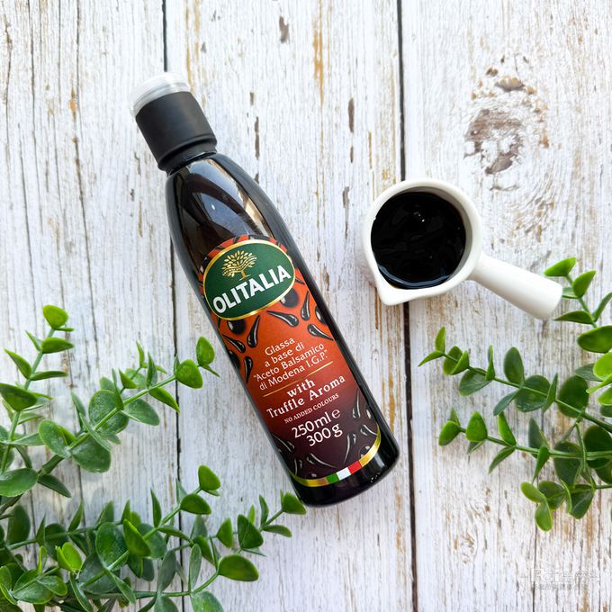 成分:經熬煮葡萄汁、摩典那巴薩米克醋、修飾澱粉(乙醯化己二酸二澱粉)、玉米糖膠、松露香料、松露粉