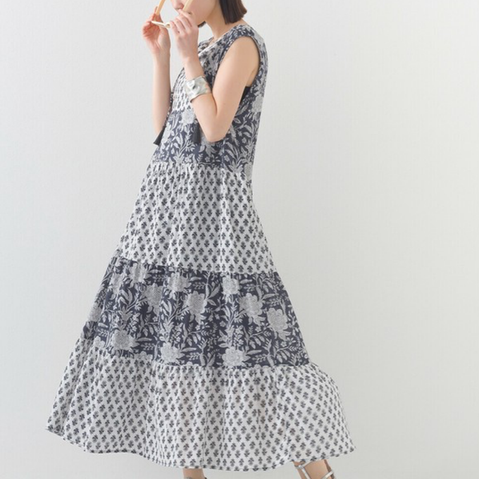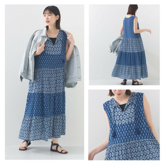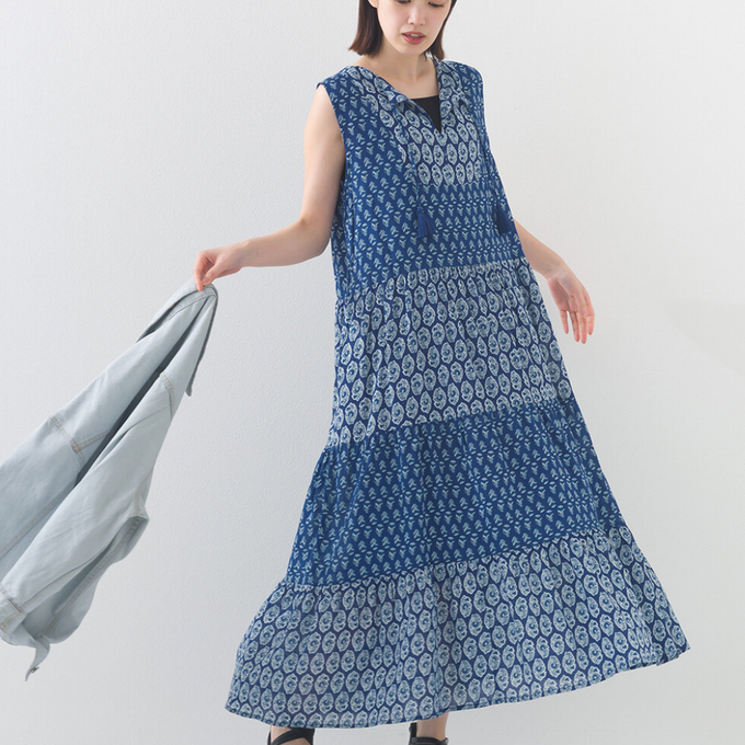 日本 OMNES - 100%印度棉 奢華印花流蘇無袖洋裝-深藍