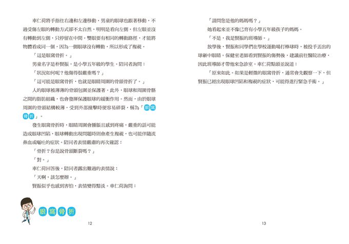 乍看之下會以為是孩子系的漫畫,不,感覺就像在看韓劇,卻默默置入了眼睛的知識和各種小祕密!關於眼科學的部分,本書介紹得很詳細、專業,大致把日常會遇到的眼科狀況都囊括進去了。個人覺得適合比較大的孩子或成人閱讀,對初進醫學院的學生也很推薦,可以把眼科的基本知識無痛複習一遍。