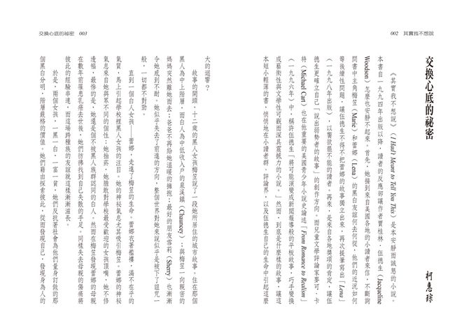 《其實我不想說》(I Had’t Meant to Tell You This)是本安靜而誠懇的小說。本書自一九九四年出版以降,讀者的反應卻讓作者賈桂林.伍德生(JacquelineWoodson)怎麼也安靜不起來。首先,她接到來自美國各地的小讀者來信,不斷詢問書中主角梅笠(Marie)和蕾娜(Lena)的黑白友誼何去何從,他們的近況如何等後續性問題,讓伍德生不得不把蕾娜的故事獨立出來,再次提筆寫出「Lena」