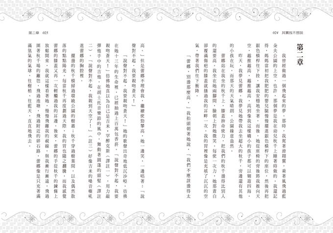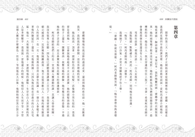 我知道雷納說的事情,我在書裡曾讀過類似的報導。但是這種事,應該不可能會發生在我認識的人身上,那應該是發生在第三世界國家,或是可憐的異族女孩身上才對。這些女孩應該是住在擁擠的公寓裡,或者是住在美國南部才是。這種事,怎麼可能會發生在俄亥俄州的泉溪鎮呢?怎麼有可能會發生在雷娜——這個跟我一起走路回家,導師時間孩坐在我旁邊的女孩身上呢?怎麼會發生在穿著破舊,頂著不正經笑容,帶著一副堅定而悲傷的眼神的雷娜——我的朋友身上?(節錄於第十四章)