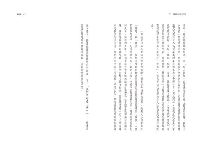 一部優質作品不會讓我們更加偏激,而是提升讀者的視界,鼓勵讀者勇於「跨越」與「跨界」,包括召喚跨出舒適同溫層的其他同理及更普世之關懷。這正是賈桂琳.伍德生《其實我不想說》三十年來經典傳世的價值。