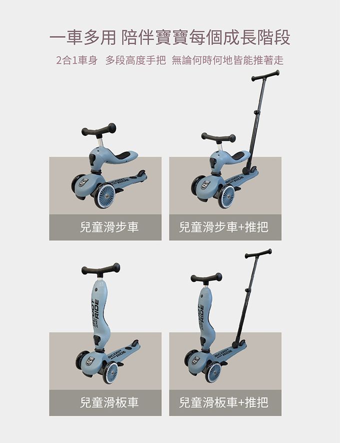 注意事項:【商品規格】 適用年齡:1-5歲 主要材質:合金鋼、鋁、PU、PP、TPR 適合身高:82-118 cm 座椅最大承重:20 kg 腳踏最大承重:50 kg 車把高度:57-64 cm 推把高度:82-92 cm 輪胎尺寸:前輪120 mm、後輪80 mm 商品重量:3.5 kg 座椅高度:22.5-29 cm 產地:中國 商品檢驗標識號:R45656 【注意事項】 ● 本產品無剎車功能。 ● 本產品適用於1-5歲之兒童使用。 ● 本產品僅限一人使用,不得超載。 ● 請小心小零件,避免窒息的危險。 ● 兒童使用本產品時,需有成人在旁監護。 ● 使用時,不容許用自行車、汽車或者其他車拖行。 ● 使用前,請完整閱讀使用說明書,必需中成人組裝。 ● 確保推桿牢固接合在腳踏板上,聽到〝喀〞聲即鎖定完成。 ● 使用本產品請穿載防護裝備(安全帽、護膝、護肘、鞋子)。 ● 不允許任意修改,修改後可能會減低產品的安全性贈成危險。 ● 使用前,請檢查所有連接位,確保所有連接位和螺絲皆有鎖緊。 ● 使用需要一些技巧,以避免跌倒或碰撞而引致使用者或第三方受傷。 ● 禁止於公共及一般道路使用,請在平坦平滑、安全、遠離交通道路的地方使用。 ● 推桿僅供成人使用,確保在安裝推桿的情况下,不讓孩子獨自騎車,避免跌倒風險。 ● 坐姿模式下體重超過20KG之兒童不得使用,站姿模式下體重超過50KG之兒童不得使用。 ● 商品尺寸測量存在些許誤差,請依實際商品為主。