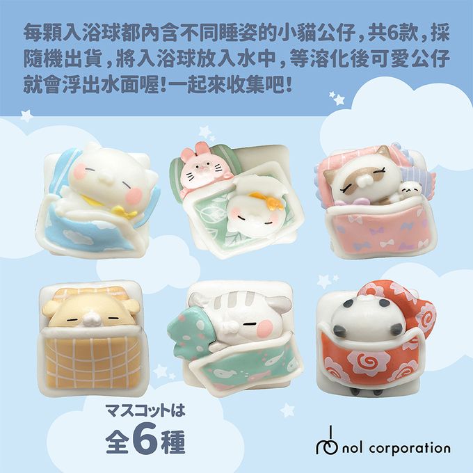 日本LINE原創貼圖「小貓」為主題,不同睡姿的小貓公仔,共6款,歡樂泡澡時光兼具收集樂趣!
