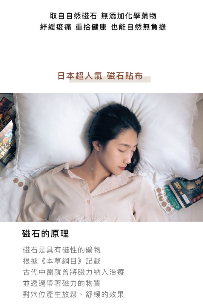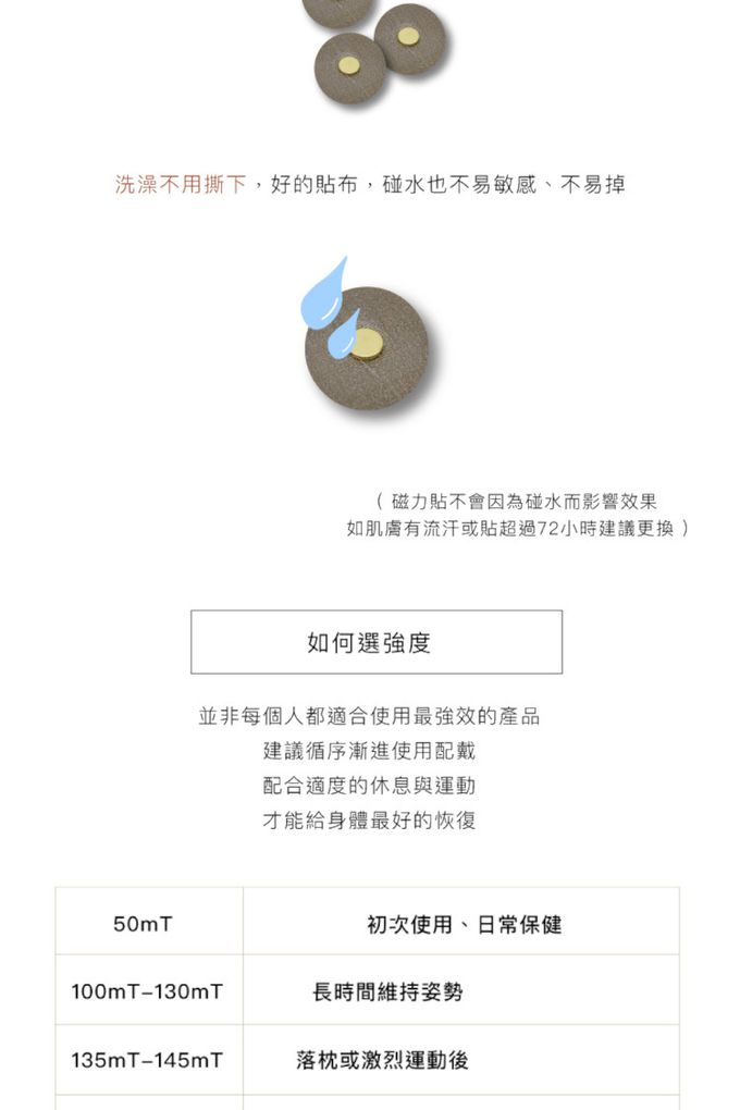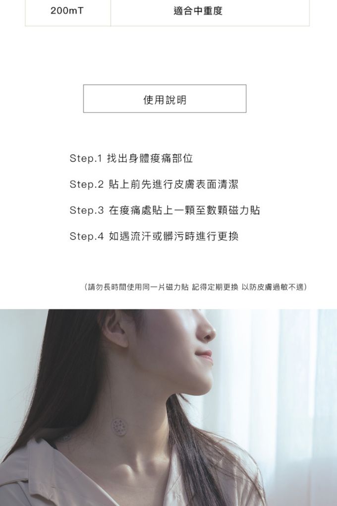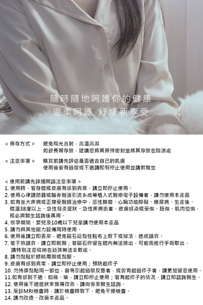 注意事項:< 使用前請先詳細閱讀注意事項 -使用時,若身體或皮膚有感到異常,請立即停止使用。 -使用心律調節器或腦脊髓液引流系統等植入式醫療電子設備者,請勿使用本產品 -如有重大疾病或正接受醫師治療中,惡性腫瘤、心臟功能障礙、糖尿病、生產後、體溫度以上、急性發炎症狀、急性疾病患者、皮膚感染或受傷、扭傷、肌肉拉傷,務必與醫生諮詢後再用。 -懷孕期間、嬰兒及歲以下兒童請勿使用本產品 -請勿與其他磁力設備同時使用。 -使用後請立即丟棄,避免磁石從黏性貼布上取下或掉落,造成誤食。 -若不慎誤食,請立即就醫;若磁石停留在體內無法排出,可能需進行手術取出,請特別注意收納在幼孩無法拿取處。 -請勿黏貼於眼睛周圍或黏膜。 -皮膚有感到異常,請立即停止使用;預防起疹子 -勿持續黏貼同一部位,容易引起過敏反應者,或曾有起過疹子者,請更加留意使用。 -如有感到不適,如痛、癢,請立即停止使用;若有起疹子的情況,請立即諮詢醫生。 -使用後不適症狀未獲得改善,請向專業醫生諮詢。 -受診檢查時,請於檢查時取下,避免干擾檢查。 -請勿改造、改裝本產品。
