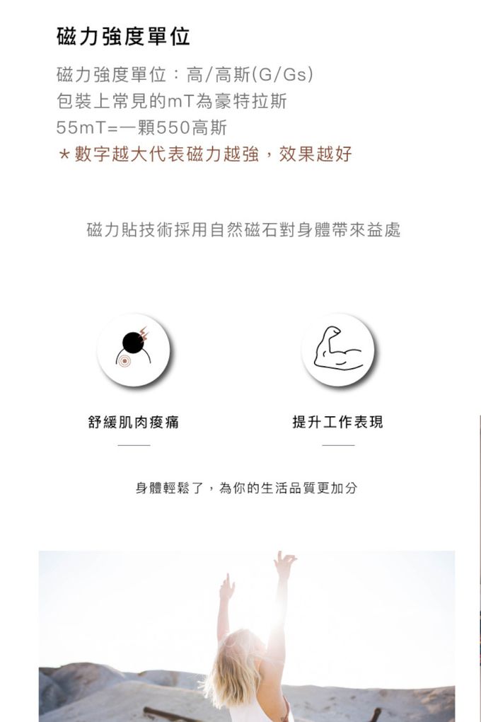 注意事項:< 使用前請先詳細閱讀注意事項 -使用時,若身體或皮膚有感到異常,請立即停止使用。 -使用心律調節器或腦脊髓液引流系統等植入式醫療電子設備者,請勿使用本產品 -如有重大疾病或正接受醫師治療中,惡性腫瘤、心臟功能障礙、糖尿病、生產後、體溫度以上、急性發炎症狀、急性疾病患者、皮膚感染或受傷、扭傷、肌肉拉傷,務必與醫生諮詢後再用。 -懷孕期間、嬰兒及歲以下兒童請勿使用本產品 -請勿與其他磁力設備同時使用。 -使用後請立即丟棄,避免磁石從黏性貼布上取下或掉落,造成誤食。 -若不慎誤食,請立即就醫;若磁石停留在體內無法排出,可能需進行手術取出,請特別注意收納在幼孩無法拿取處。 -請勿黏貼於眼睛周圍或黏膜。 -皮膚有感到異常,請立即停止使用;預防起疹子 -勿持續黏貼同一部位,容易引起過敏反應者,或曾有起過疹子者,請更加留意使用。 -如有感到不適,如痛、癢,請立即停止使用;若有起疹子的情況,請立即諮詢醫生。 -使用後不適症狀未獲得改善,請向專業醫生諮詢。 -受診檢查時,請於檢查時取下,避免干擾檢查。 -請勿改造、改裝本產品。